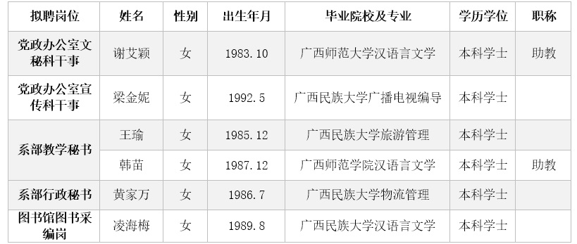 根据《关于印发< 广西壮族自治区事业单位公开招聘人员实施办法>的通知》(桂人社发[2011]155号)及《广西银行学校2018年冬季公开招聘非实名制人员公告》的有关规定,通过报名、资格审查、考试、考核、体检等程序,经研究决定,拟聘谢艾颖等6位同志为伟德官网工作人员。现将拟聘用人员名单予以公示,公示时间为2019年1月26日-2019年2月5日,如有异议,请于2月5日下午5:00前以书面形式并署真实姓名反馈到学校纪委或组织人事处。联系地址:广西南宁市大学东路91号,邮政编码:530007,联系电话:0771—3240084,0771—3278961。