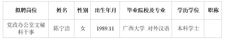 根据《关于印发< 广西壮族自治区事业单位公开招聘人员实施办法>的通知》(桂人社发[2011]155号)及《广西银行学校2018年冬季公开招聘非实名制人员公告》的有关规定,通过报名、资格审查、考试、考核、体检等程序,经研究决定,拟聘陈宁洁同志为伟德官网工作人员。现将拟聘用人员名单予以公示,公示时间为2019年2月9日-2019年2月19日,如有异议,请于2月19日下午5:00前以书面形式并署真实姓名反馈到学校纪委或组织人事处。联系地址:广西南宁市大学东路91号,邮政编码:530007,联系电话:0771—3240084,0771—3278961。