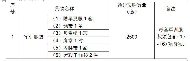 1.项目概况:本项目是伟德国际victor1946军训服装采购项目,预计采购2500套军训服装,每套军训服装包含陆军夏服、迷彩服、贝雷帽等6项货物;