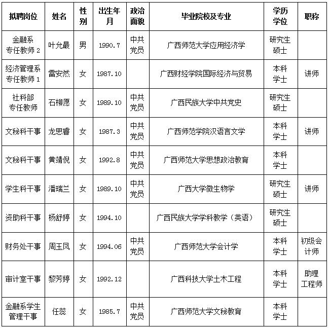根据《关于印发<广西壮族自治区事业单位公开招聘人员实施办法>的通知》(桂人社发[2011]155号)及《伟德国际victor19462020年第一批公开招聘非实名人员控制数工作人员公告》的有关规定,通过报名、资格审查、考试、考核、体检等程序,经研究决定,拟聘叶允最等10位同志为伟德官网工作人员。现将拟聘用人员名单予以公示,公示时间为2020年9月30日-2020年10月15日,如有异议,请于10月15日下午5:00前以书面形式并署真实姓名反馈到学院纪委或组织人事处。联系地址:广西南宁市大学西路168号,邮政编码:530007,联系电话:0771—3481676,0771—3481779。