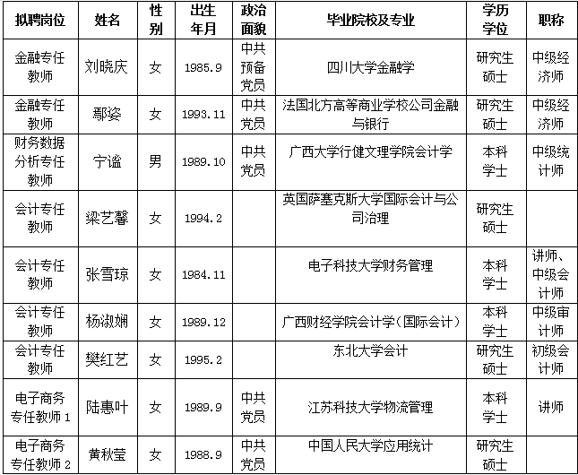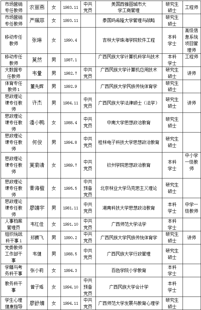 根据《关于印发<广西壮族自治区事业单位公开招聘人员实施办法>的通知》(桂人社发[2011]155号)及《伟德国际victor19462021年第一批公开招聘非实名人员控制数工作人员公告》的有关规定,通过报名、资格审查、考试、考核、体检等程序,经研究决定,拟聘刘晓庆等42位同志为伟德官网工作人员。现将拟聘用人员名单予以公示,公示时间为2021年11月30日-2021年12月8日,如有异议,请于12月8日下午5:00前以书面形式并署真实姓名反馈到学院纪委或组织人事处。联系地址:广西南宁市大学西路168号,邮政编码:530007,联系电话:0771—3481676,0771—3481779。