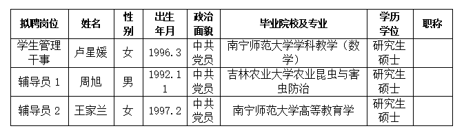 根据《关于印发<广西壮族自治区事业单位公开招聘人员实施办法>的通知》(桂人社发[2011]155号)及《伟德国际victor19462022年第一批公开招聘非实名人员控制数工作人员公告》的有关规定,通过报名、资格审查、考试、考核、体检等程序,经研究决定,拟聘卢星媛等3位同志为伟德官网工作人员。现将拟聘用人员名单予以公示,公示时间为2022年9月2日-2022年9月8日,如有异议,请于9月8日下午5:00前以书面形式并署真实姓名反馈到学院纪委或组织人事处。联系地址:广西南宁市大学西路168号,邮政编码:530007,联系电话:0771—3481338,0771—3481779。