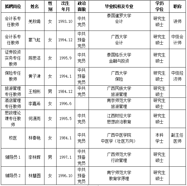 根据《关于印发<广西壮族自治区事业单位公开招聘人员实施办法>的通知》(桂人社发[2011]155号)及《伟德国际victor19462023年第一批公开招聘非实名人员控制数工作人员公告》的有关规定,通过报名、资格审查、考试、考核、体检等程序,经研究决定,拟聘羌秋璐等10位同志为伟德官网工作人员。现将拟聘用人员名单予以公示,公示时间为2023年5月17日-2023年5月23日,如有异议,请于5月23日下午5:00前以书面形式并署真实姓名反馈到学院纪委或组织人事处。联系地址:广西南宁市大学西路168号,邮政编码:530007,联系电话:0771—3481338,0771—3481779。