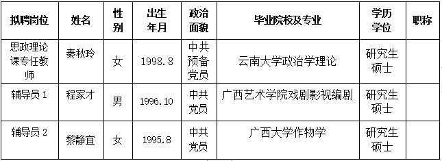 根据《关于印发<广西壮族自治区事业单位公开招聘人员实施办法>的通知》(桂人社发[2011]155号)及《伟德国际victor19462023年第一批公开招聘非实名人员控制数工作人员公告》的有关规定,通过报名、资格审查、考试、考核、体检等程序,经研究决定,拟聘秦秋玲等3位同志为伟德官网工作人员。现将拟聘用人员名单予以公示,公示时间为2023年6月20日-2023年6月26日,如有异议,请于6月26日下午5:00前以书面形式并署真实姓名反馈到学院纪委或组织人事处。联系地址:广西南宁市大学西路168号,邮政编码:530007,联系电话:0771—3481338,0771—3481779。