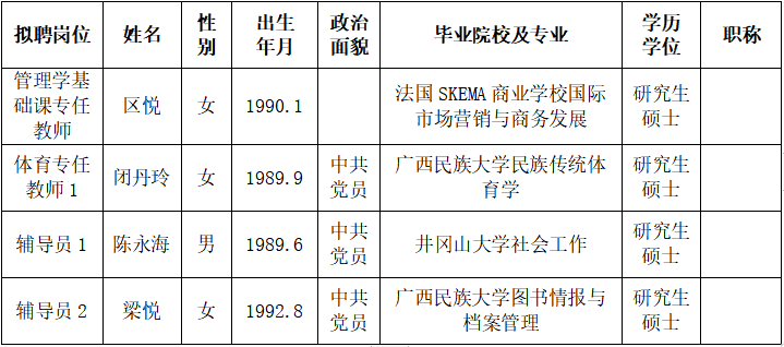 根据《关于印发<广西壮族自治区事业单位公开招聘人员实施办法>的通知》(桂人社发〔2011〕155号)及《伟德国际victor19462023年第二批公开招聘非实名人员控制数工作人员公告》的有关规定,通过报名、资格审查、考试、考核、体检等程序,经研究决定,拟聘区悦等4位同志为伟德官网工作人员。现将拟聘用人员名单予以公示,公示时间为2024年1月22日-2024年1月28日,如有异议,请于2024年1月28日下午5:00前以书面形式并署真实姓名反馈到学院纪委或组织人事处。联系地址:广西南宁市大学西路168号,邮政编码:530007,联系电话:0771—3481338,0771—3481779。