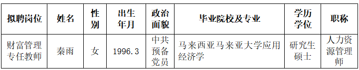 根据《关于印发<广西壮族自治区事业单位公开招聘人员实施办法>的通知》(桂人社发〔2011〕155号)及《伟德国际victor19462023年第二批公开招聘非实名人员控制数工作人员公告》的有关规定,通过报名、资格审查、考试、考核、体检等程序,经研究决定,拟聘秦雨同志为伟德官网工作人员。现将拟聘用人员名单予以公示,公示时间为2024年2月27日-2024年3月4日,如有异议,请于2024年3月4日下午5:00前以书面形式并署真实姓名反馈到学院纪委或组织人事处。联系地址:广西南宁市大学西路168号,邮政编码:530007,联系电话:0771—3481338,0771—3481779。