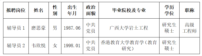 根据《关于印发<广西壮族自治区事业单位公开招聘人员实施办法>的通知》(桂人社发〔2011〕155号)及《伟德国际victor19462024年第一批公开招聘非实名人员控制数工作人员公告》的有关规定,通过报名、资格审查、考试、考核、体检等程序,经研究决定,拟聘磨思豪、韦欣悦同志为我校工作人员。现将拟聘用人员名单予以公示,公示时间为2024年8月27日-2024年9月2日,如有异议,请于2024年9月2日下午5:00前以书面形式并署真实姓名反馈到学校纪委或人事处。联系地址:广西南宁市大学西路168号,邮政编码:530007,联系电话:0771—3481338,0771—3481779。