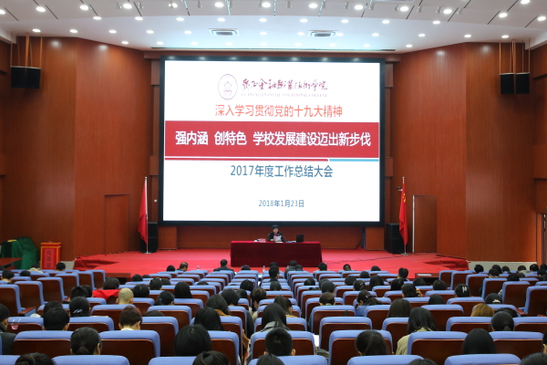 党委书记沈立君代表学院作2017年学院工作总结。她首先向一年来辛勤工作,关心、支持学校发展的全体教职员工表示衷心感谢。随后,以“强内涵、创特色,加快学校建设发展新跨越”为主题,从党建工作、西校区建设、内涵建设、招生就业工作、国际交流合作、社会服务能力、信息化管理建设、学校综合管理等方面详细总结了一年来学校工作取得的成绩。同时,部署2018年寒假工作,并提出要求。沈书记指出,2018年是学校加快推进“十三五”规划实施,实现规范彰显特色的关键一年,希望全校师生坚持依法治校,推进科学管理,真抓实干、攻坚克难,以新的思路、新的作风、新的突破、新的业绩,为推进“十三五”取得成效,不断推动学院学校朝着金融行业特色鲜明的优质高等职业院校的发展目标作出新的更大贡献。