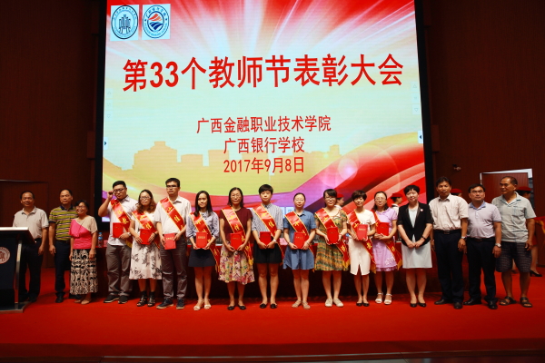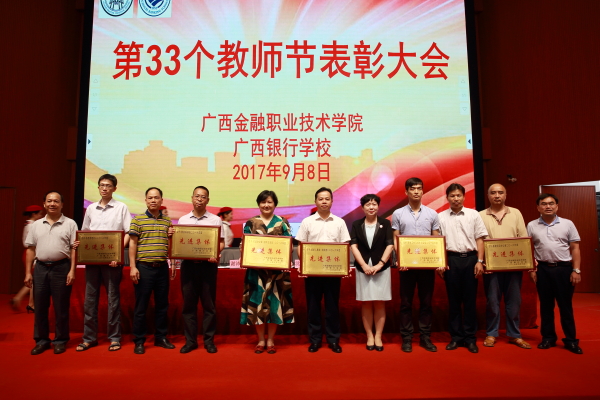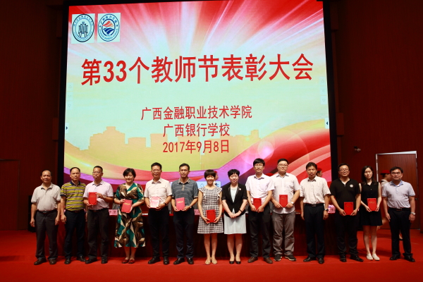 表彰大会在庄严的国歌声中拉开帷幕,随后教师们集体观看了黄大年同志先进事迹视频,并为离退休教师代表献花。随后,党委书记、院长沈立君、党委副书记刘华政、副院长谢沛善、副院长潘大胜、院长助理罗坚分别宣读了《关于表彰2016--2017学年十佳教师的决定》、《关于表彰2016年度先进集体的决定》、《关于表彰2016年度伟德国际victor1946(广西银行学校)先进工作者的决定》、《关于给校龄满25年女的教职工及校龄满30年男教职工颁发荣誉证书的决定》、《关于聘任2017年带教指导教师、带教班主任的通知》,学院(校)领导班子为“十佳教师”、“先进集体”、“先进工作者”“校龄满30年教职工”颁奖,对他们的工作和付出予以肯定。