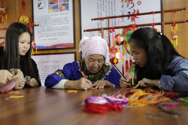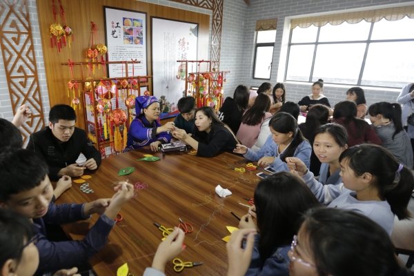 3月14至15日,“中华巧女”黄肖琴老师与其传承人赵金玉老师到伟德官网民族文化实训基地——“中华巧女”黄肖琴壮族绣球工作室进行绣球文化传承的教学指导,手把手教授旅游管理系师生学习绣球制作。