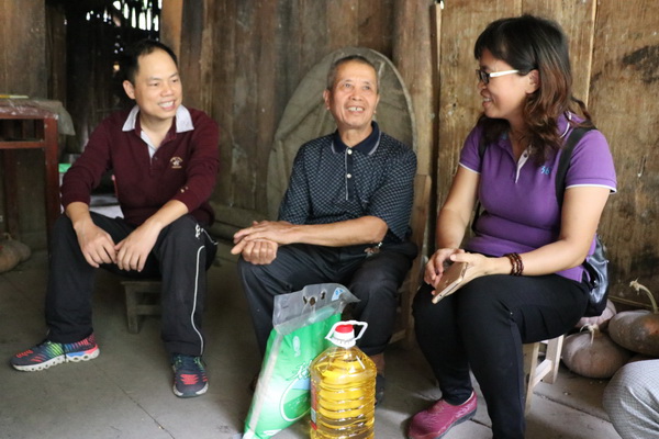 各小分队驱车深入村屯,爬山越岭,到贫困户家中发放米、食用油和慰问金,与群众促膝座谈,了解群众的难处;对家里有上学的儿童、青少年,给予高度的人文关怀,了解学习情况、政策享受情况,鼓励他们用知识改变自己和家庭的命运;对有山上落石威胁房屋的村民,做好安全宣传和救灾的相关知识普及工作。