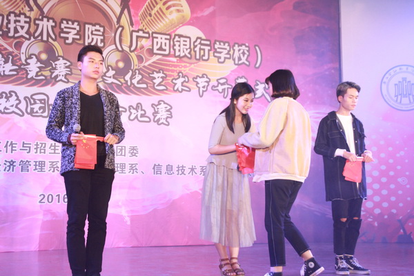 比赛一开始,选手们怀揣着激情与梦想,用他们美妙的歌声感染着观众的心灵,不仅尽情地展示出自己歌唱才华,创造出一幅幅声色兼美的亮丽风景,而且还用自己动听的歌声和不俗的舞台表现,诠释着青春飞扬含义。整个比赛过程气氛热烈,激情四溢,掌声和喝彩经久不息,一次次将晚会的气氛推向高潮。一轮视听盛宴后,比赛结果也随之出炉。由各评委以及观众投票选出最美的歌声,来自高职互联网金融1603班的黄勇获得冠军,中职金融1604班的谢芸智获得亚军,高职金融管理1610班的梁艺耀获得季军。