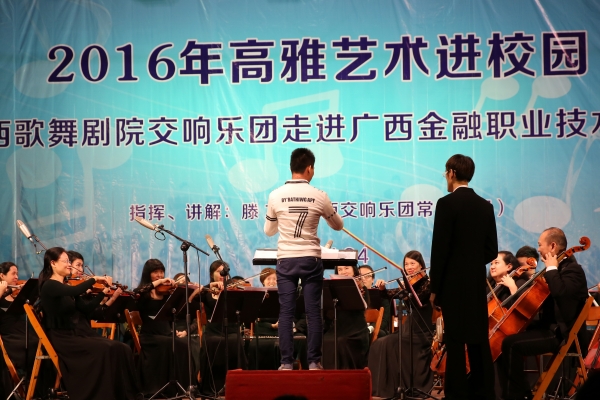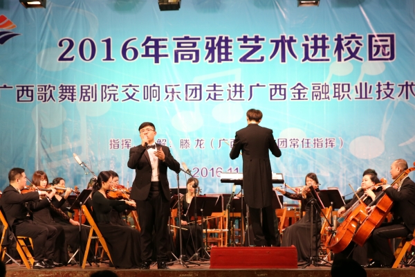 为了丰富同学们的课余生活,使同学们能够近距离的接触高雅艺术,11月24日晚,伟德官网有幸邀请到了广西歌舞剧院交响乐团到学校进行演奏。学院党委副书记、纪委书记刘华政,副院长谢沛善,学生工作与招生就业处副处长周海峰与六百余名金院学子在东校区大礼堂聆听了由广西歌舞剧院交响乐团带来的音乐盛宴。