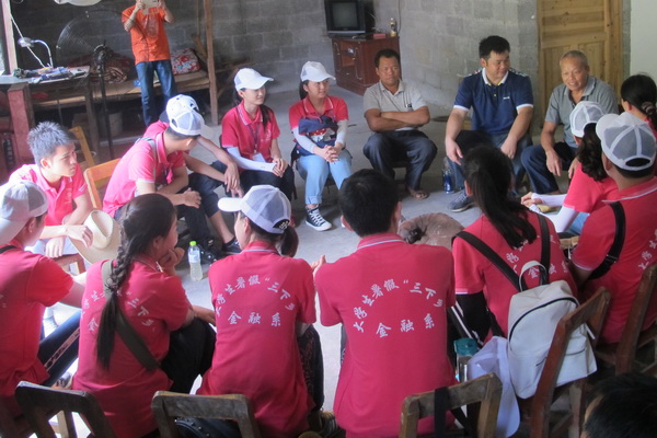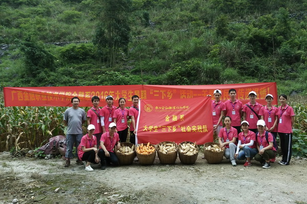 以“助力脱贫攻坚战”为活动主题,本着引导广大青年学生在实践中成长、培养吃苦耐劳和务实奉献的精神的目的,我系首次组织的大学生暑期“三下乡”活动内容主要有关爱留守儿童、捐赠书物、看望孤寡老人和贫困村民、体验农活、宣传金融知识、走访调研记录村民的主要经济来源和贫困原因等。在院团委老师的指导下,在本校第一书记的全力协助下,金融系“三下乡”暑期实践团在河池市都安县菁盛乡内曹村(第一书记覃其兴)和东成村(第一书记赵欣)展开了一系列爱心帮扶活动,于7月15日圆满结束了为期一周的实践活动。