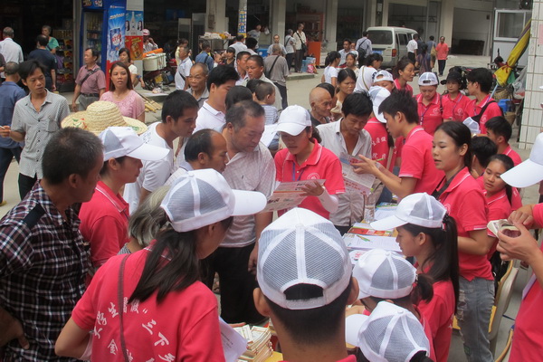 在都安县菁盛乡政府的协助下,我们在菁盛乡市场中心的中国农村信用合作社门口设立了金融知识宣传点,为来往村民讲解如何识别真****知识、如何使用银行自助系统以及如何防止短信和电话诈骗等(如图三),为热闹的圩日增加了一大亮点。