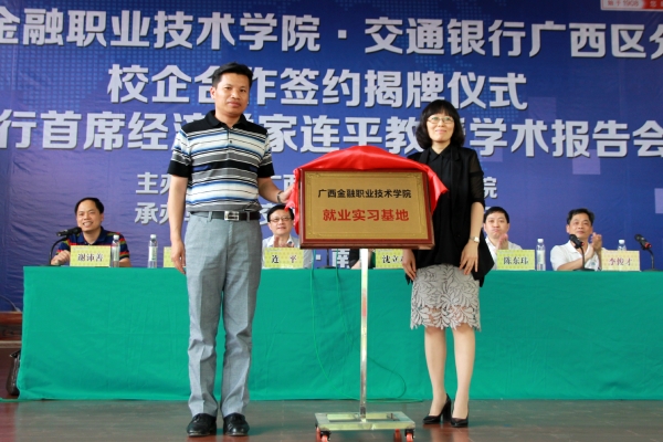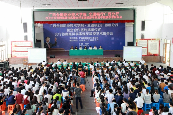 4月25日,伟德官网与交通银行广西分行在院大礼堂召开“金融精英面对面”校企合作签约揭牌仪式暨连平教授学术报告会。自治区教育厅职成处李俊才,交通银行首席经济学家连平教授,交通银行广西分行副行长陈东玮,交通银行广西分行副行长凌敏杰,学院院长沈立君,党委副书记、纪委书记刘华政,副院长谢沛善出席会议,伟德官网师生代表参加会议。会议由谢沛善副院长主持。