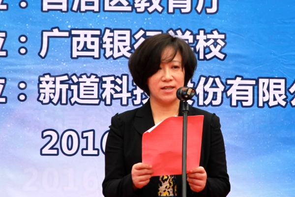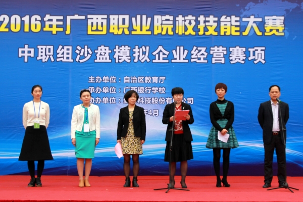 4月1日上午,由自治区教育厅主办, 广西银行学校承办的2016广西职业院校技能大赛(中职组)沙盘模拟企业经营赛在广西银行学校隆重开幕。教育厅职称处副处长莫海燕,本赛项裁判长、广西大学商学院教授范伟,裁判员代表、广西师范学院陈婷,新道科技股份有限公司广西分公司总经理高莹莹,校长沈立君,副校长谢沛善出席开幕式。开幕式由谢沛善副校长主持。