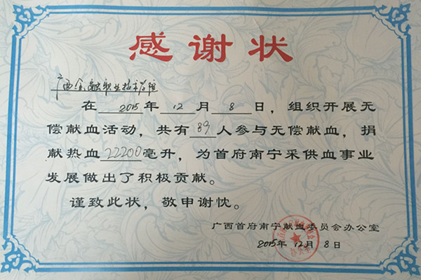 广西首府南宁献血委员会办公室对伟德官网此次无偿献血活动密切关注,并在活动结束后为伟德官网颁发了感谢状,对伟德官网师生在活动中作出的贡献表示崇高的敬意和衷心的感谢。