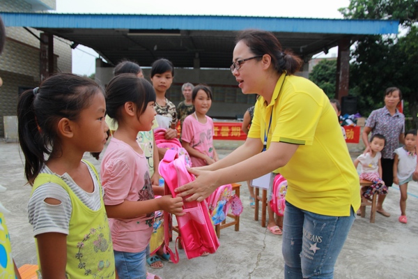 校团委书记朱丽君为贫困儿童赠送书包