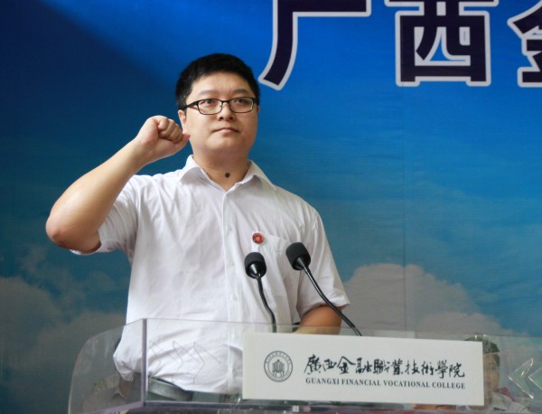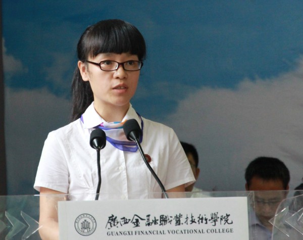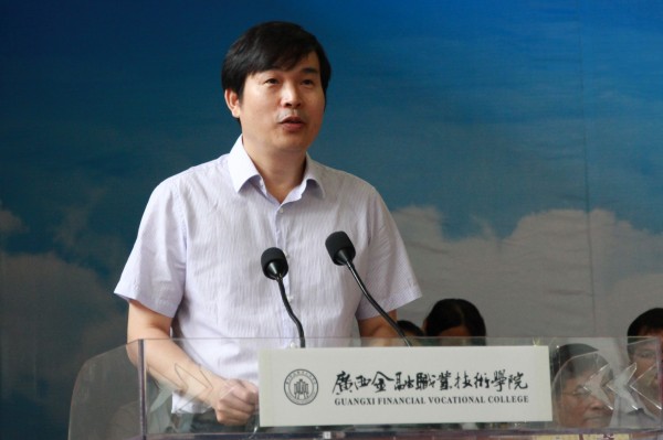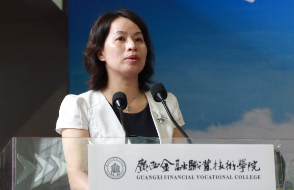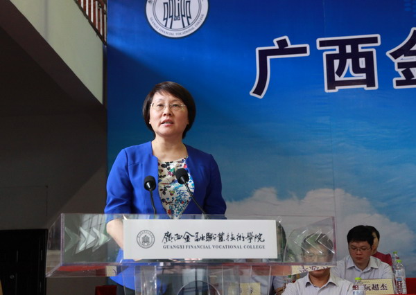 随后,沈立君院长致欢迎词。她向2014级的全体新同学表示最热烈的欢迎和诚挚的谢意,向莅临会议的各位领导和嘉宾表示衷心的感谢。沈校长在讲话中介绍,广西金融 职业技术学院是广西唯一一所金融类公办职业学院,于今年1月获自治区人民政府批准设立,并在今年高考中招收首届学生606人。“学院将坚持高教性和职教性的统一、就业导向和全面发展的统一、人才培养和服务社会的统一,利用金融优势,抓好产教融合与校企合作,争取首届毕业生签约就业率达100%。