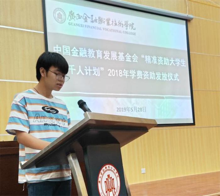 会上,受助的金融系国际金融1703班的陈源富同学表达了对自己受到资助的感谢,他说,“学校将我纳入千 人计划,既为我的家庭减轻了负担,也消除了我的后顾之忧。千 人计划给予我的帮助,让我能够以更积极的态度去面对学习和生活。”