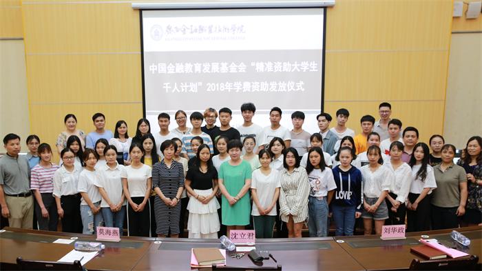 莫海燕校长宣读了《关于发放“精准资助大学生千 人计划”受助学生2018年学费的通知》,沈立君书记与莫海燕校长为受助学生发放资助金。