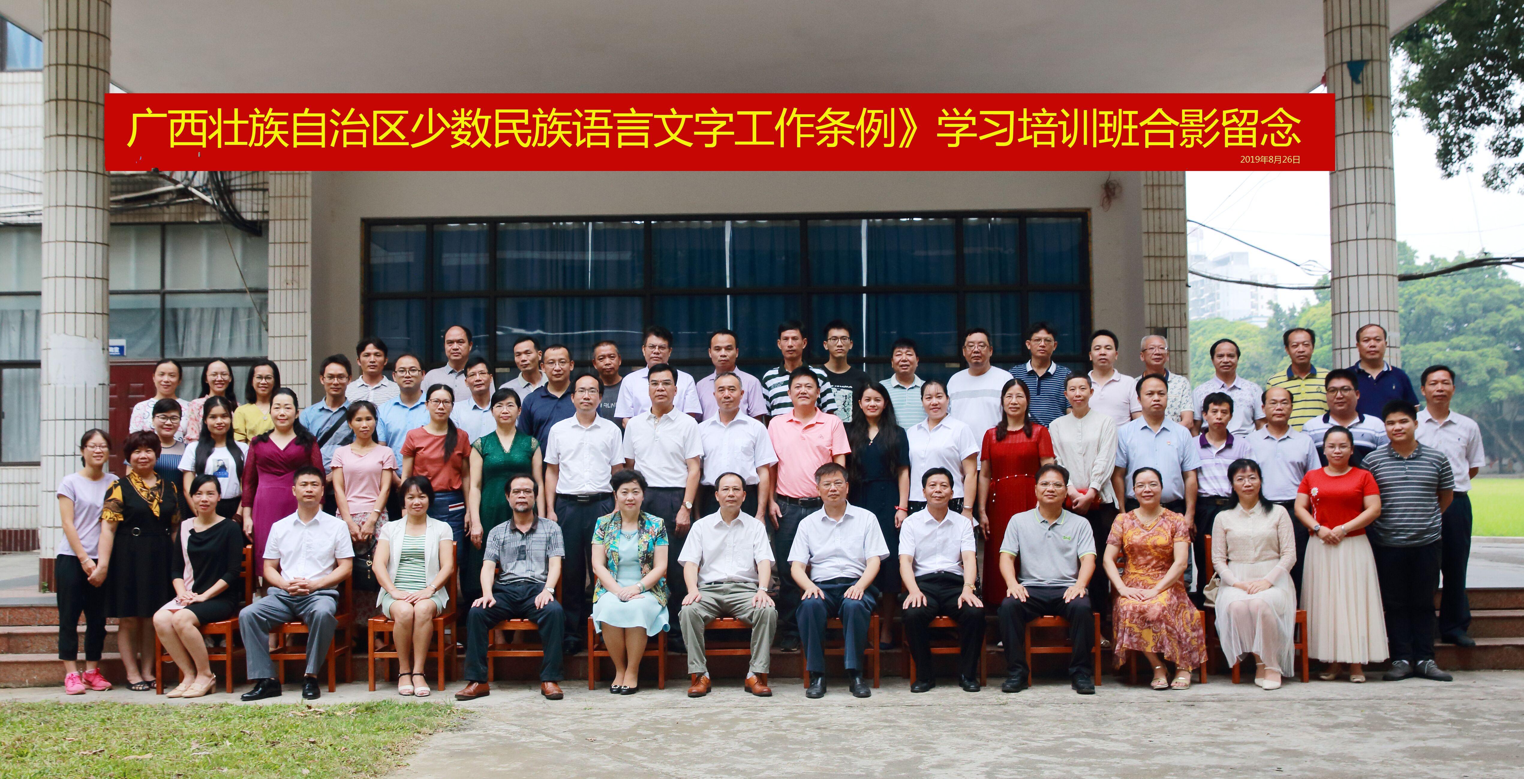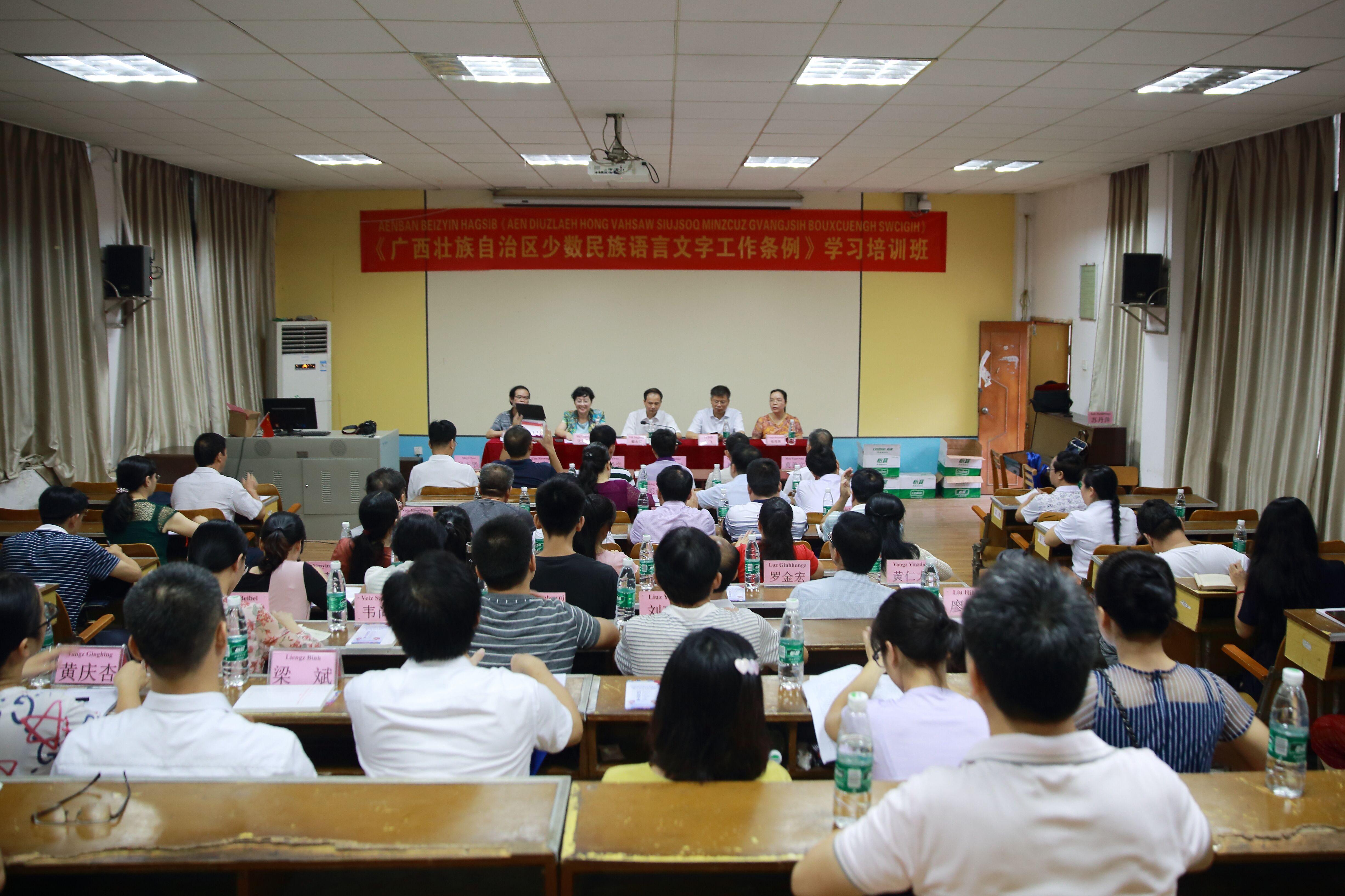 8月26日上午,为期30天的自治区民宗委举办的壮文培训班和《广西壮族自治区少数民族语言文字工作条例》学习培训班开班典礼在学院东校区举行。学院党委书记沈立君教授,自治区民宗委副主任翚永红、副巡视员余飞,自治区民宗委、广西民族语文研究中心有关负责人以及参训学员、老师共计60余人参加了开班仪式。