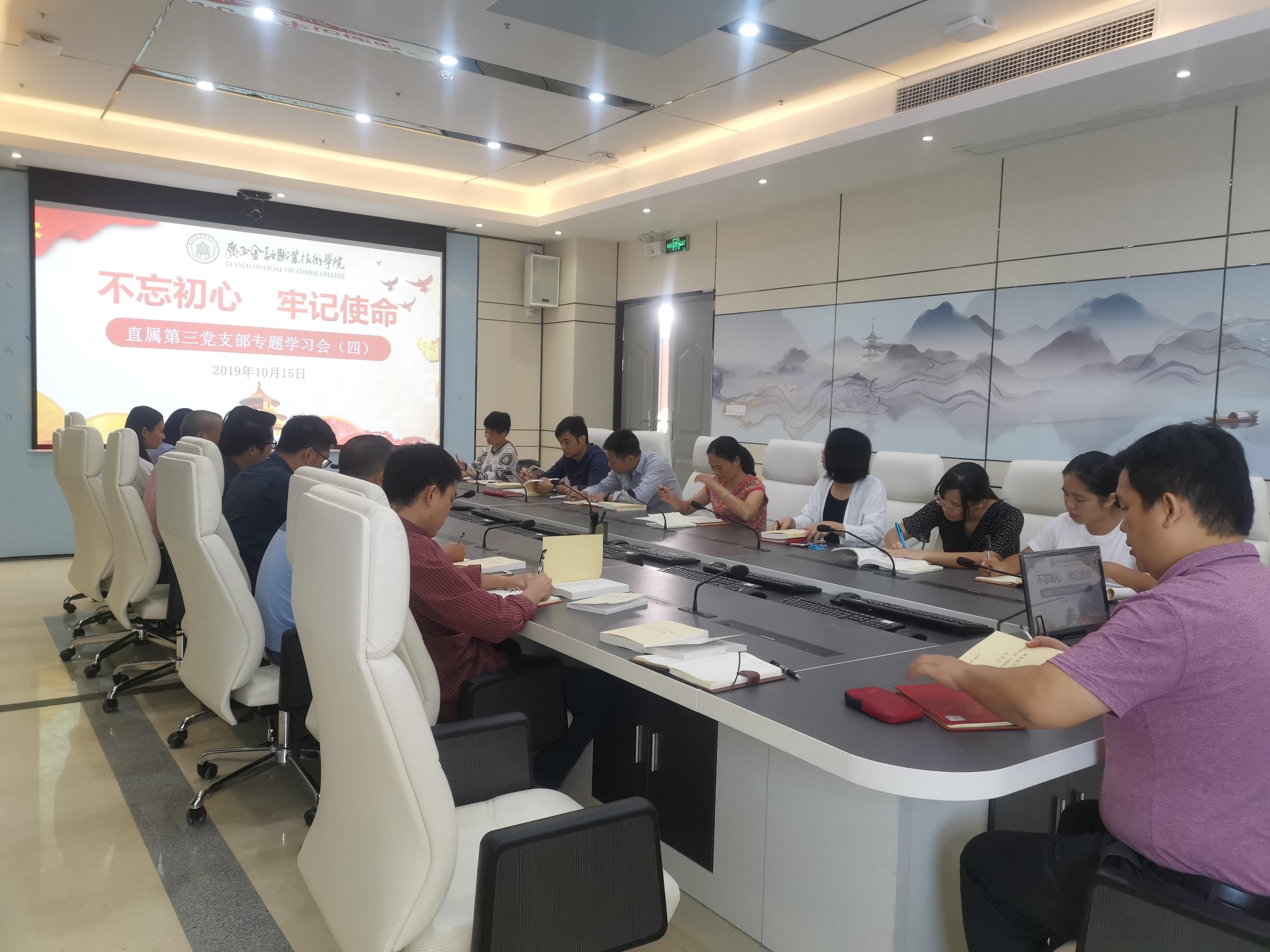10月15日,直属第三党支部全体支部党员、预备党员集中西校区行政楼103会议室开展“不忘初心、牢记使命”主题教育第四专题研讨学习。会议由支部书记周海峰主持。