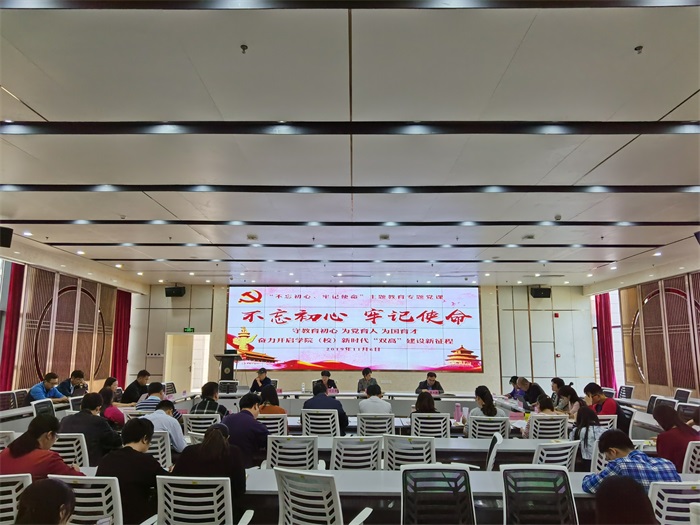 沈立君书记以《守教育初心,为党育人、为国育才,奋力开启学校新时代“双高”建设新征程》为主题给全体党员上主题教育专题党课,她指出,“不忘初心、牢记使命”既是当今政治生活中的一个重要主题,也是中国共产党人的永恒主题还是全体党员、干部的终身课题。沈立君书记还阐释了如何理解和把握中国共产党人的初心和使命、如何围绕学校教育教学事业改革发展守初心、担使命这两块内容,同时要求伟德官网全体教职员工认真对照“守初心、担使命”标准,找差距、查原因,切实增强建设金院、银校的责任感使命感。