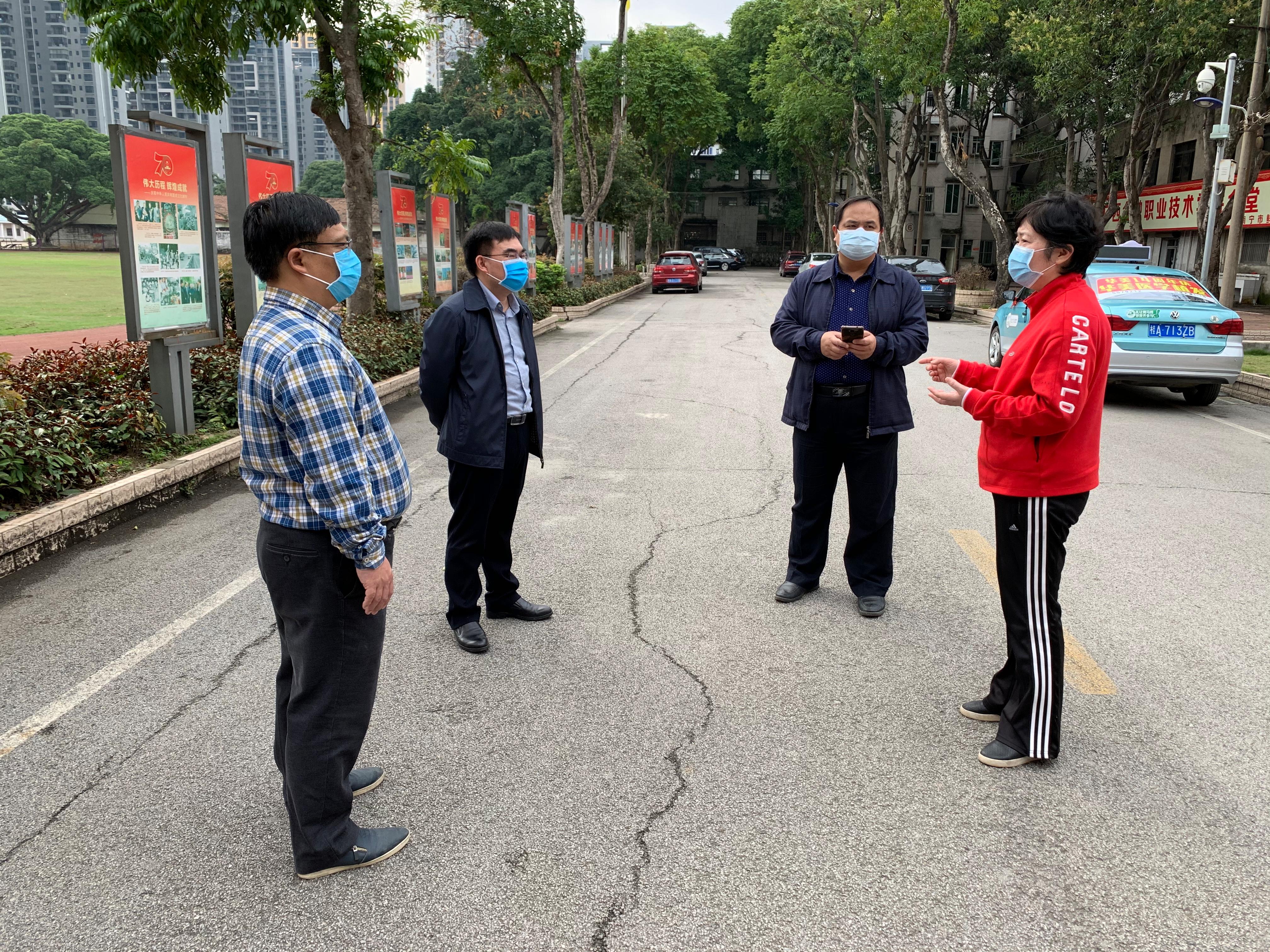 沈书记一行首先视察了东校区门卫值守工作,随后巡视巡查了学生宿舍区、教职工宿舍区、教学区和校园主干道等区域,通过详细询问、现场查看等方式,深入了解了东校区人员进出流程、登记台账、防疫用品配备及日常消杀情况等,对涉及的重点领域、重点环节、重点任务进行了再强调、再布置。沈书记表示,东校区目前虽然没有返校学生,但是居住着学校教职工,其中还有一部分还是离退休教职工。因此,要摸清东校区教职工生活区的人员底数,做到无死角排查,确保无一遗漏。既要严格贯彻落实好上级对校园防疫工作的各项要求,也要关心关怀教职工的生活状况,既要切断病毒的传播途径,也要保障教职工日常生活正常进行。