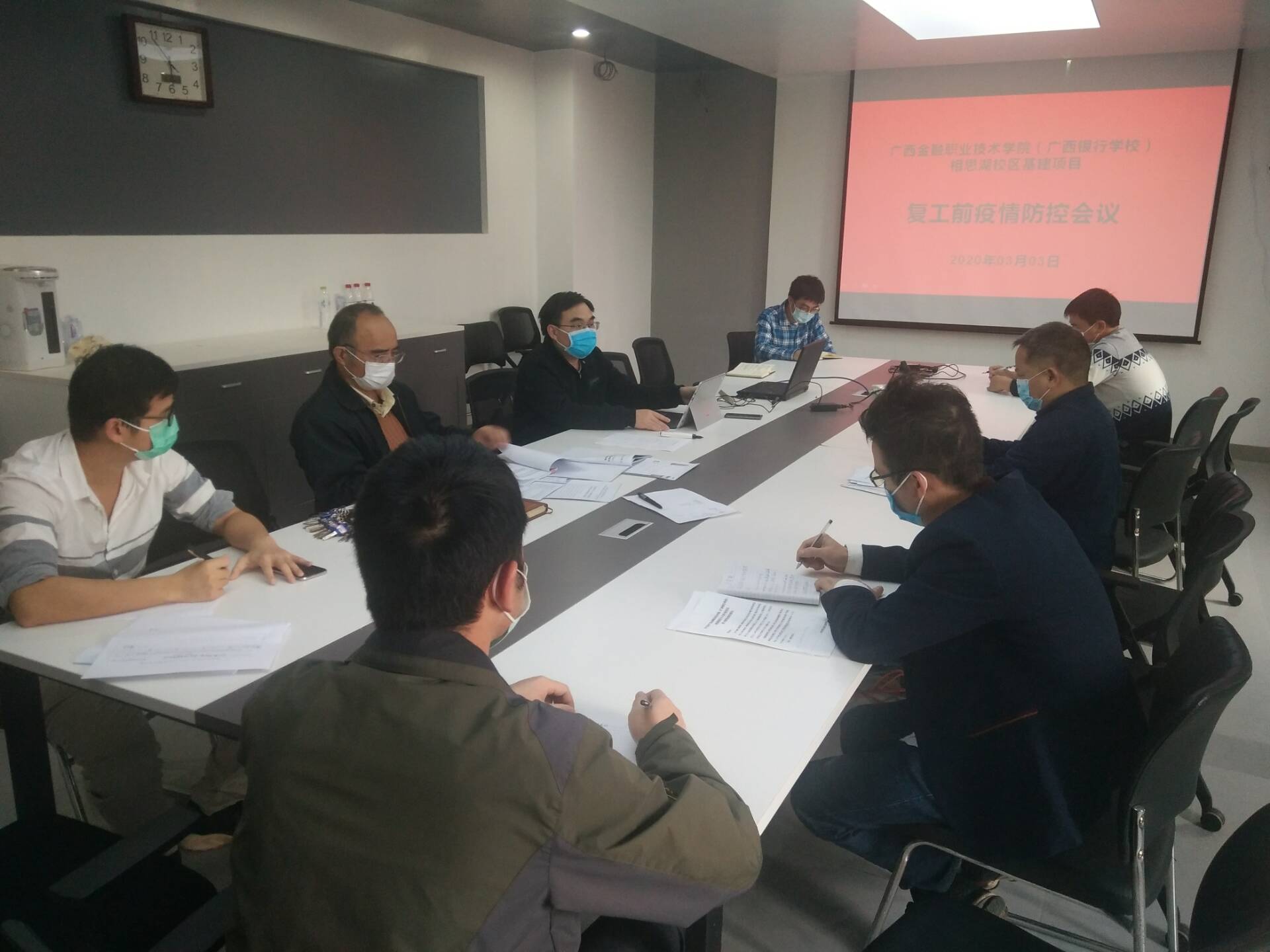 会议上,伍晓天主任传达了自治区教育厅、自治区住建厅和南宁市住建局关于新冠肺炎疫情防控的文件精神和基建项目复工防控的有关要求,并宣读了《学校疫情防控工作“十严格”》和《建筑工地疫情防控工作“十严格”》。