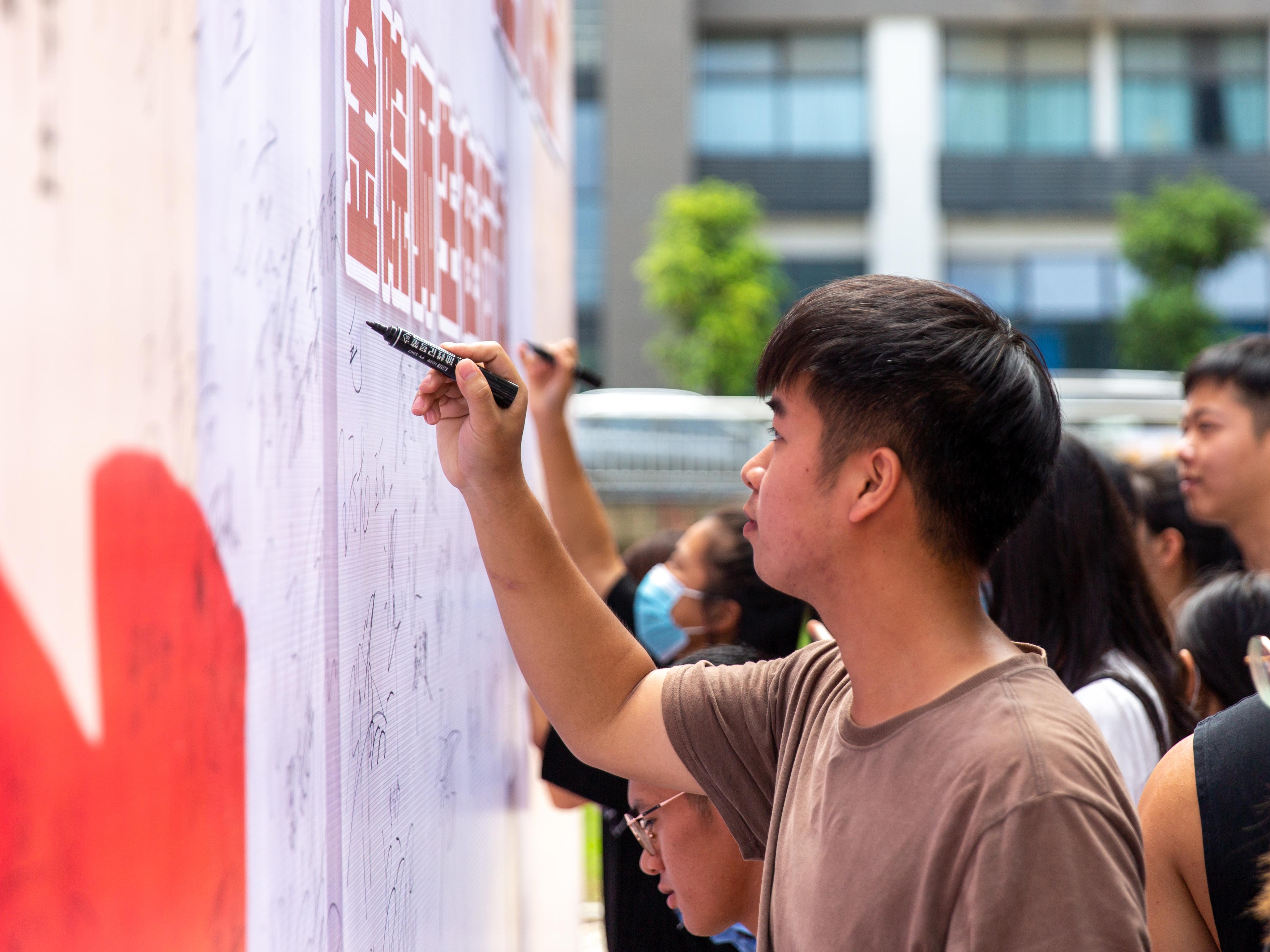 学生在“签名墙”上签名