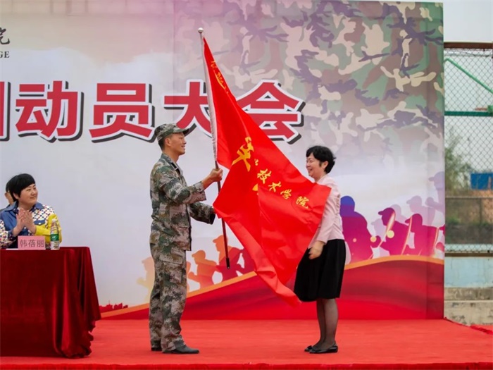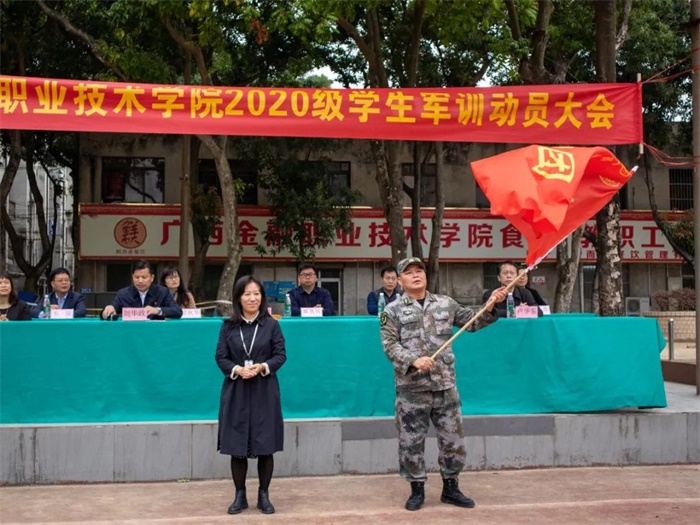 动员会最后,沈立君书记、莫海燕院长分别向承训单位广西陆战教育学生军训基地授军训团团旗,鲜红的旗帜在空中高高飞扬,标志着伟德官网2020级学生军训正式拉开帷幕!