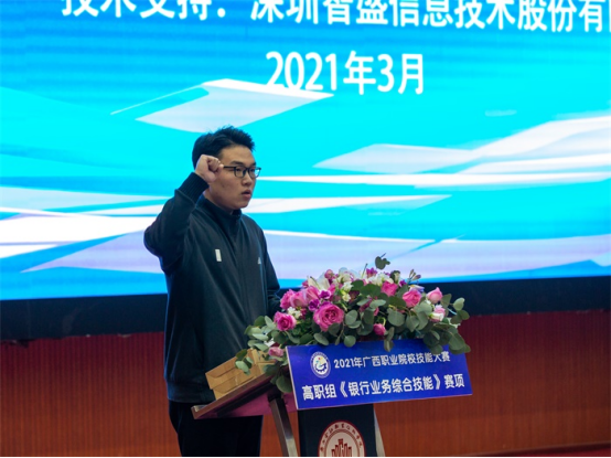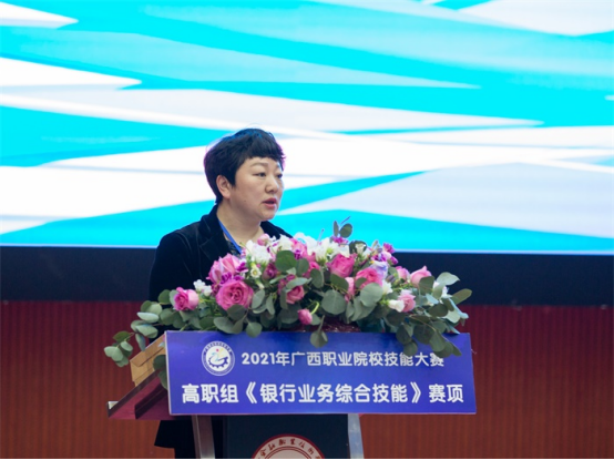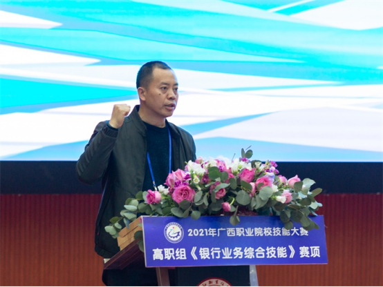 沈书记表示,2021年,是中国共产党成立100周年,是“十四五”规划开局之年,开启全面建设社会主义现代化国家新征程的关键之年,职业教育也迈入了提质培优、增值赋能的高质量发展新阶段,被赋予了更加重要的职责与使命。随着数字经济成为全球经济重要驱动力和新增长点,数字人民币在跨境支付结算中的运用,将成为趋势,广西作为我国金融改革的重要试验田,将银行业务综合技能列入比赛项目,不仅是为我区职业院校师生切磋技艺和交流经验提供良好平台,提高学生技术能力与市场需求的吻合度,更是顺应了我国新技术革命和产业结构调整的需求,适应广西数字经济产业发展的需要,进一步推动我区金融行业高技能人才的成长成才,为建设壮美广西、共圆复兴梦想提供强有力的技能人才支撑。祝愿所有参赛选手赛出风格,赛出水平,以优异的成绩向建党100周年献礼!