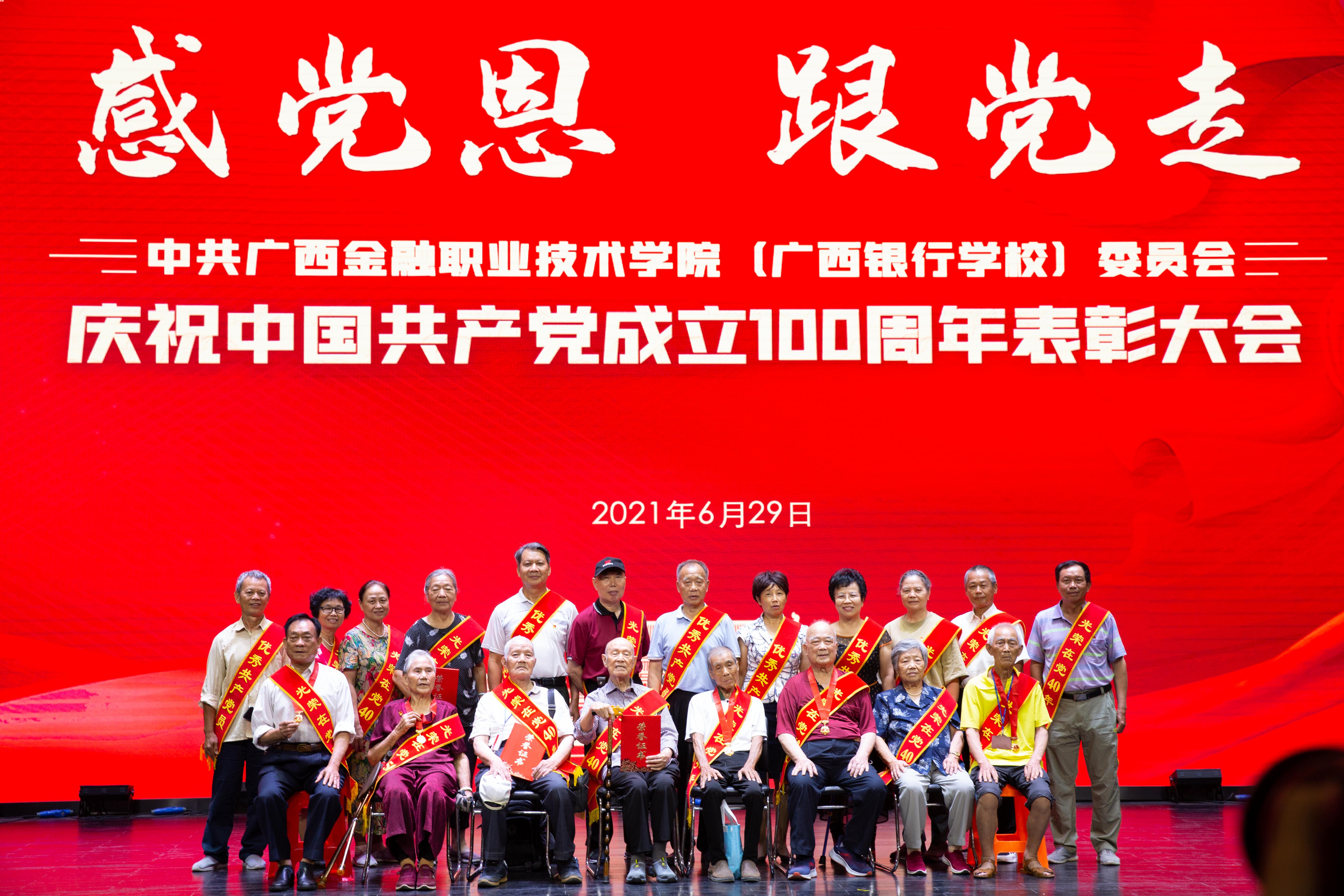 在表彰大会上颁发 “光荣在党50年”纪念章、“光荣在党40年”荣誉证书;表彰荣获自治区、区直工委、教育厅、学校的先进基层党组织和优秀党员、党务工作者,表彰脱贫攻坚的先进集体和个人,表彰“学习强国”的先进集体和学习标兵以及在自治区教育厅直属机关党史学习教育“党员心声大家谈”征文比赛、伟德官网“同心向党”书画摄影比赛中获奖的个人。