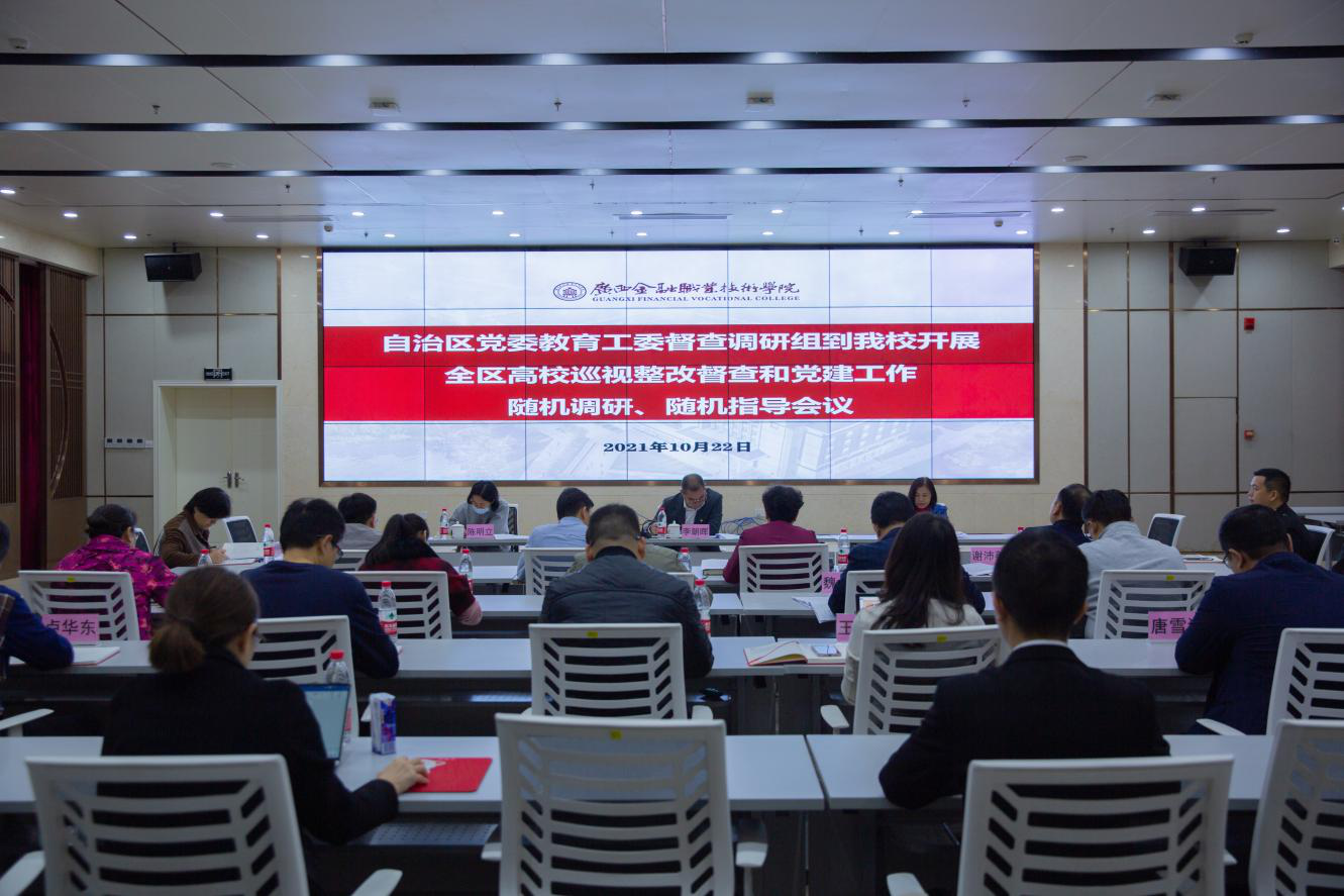 10月22日上午,自治区党委教育工委督查调研组组长、广西幼儿师范高等专科学校党委副书记李朝晖一行到伟德官网开展全区高校巡视整改督查和党建工作随机调研、随机指导。学校党委书记沈立君主持会议并作专题汇报。