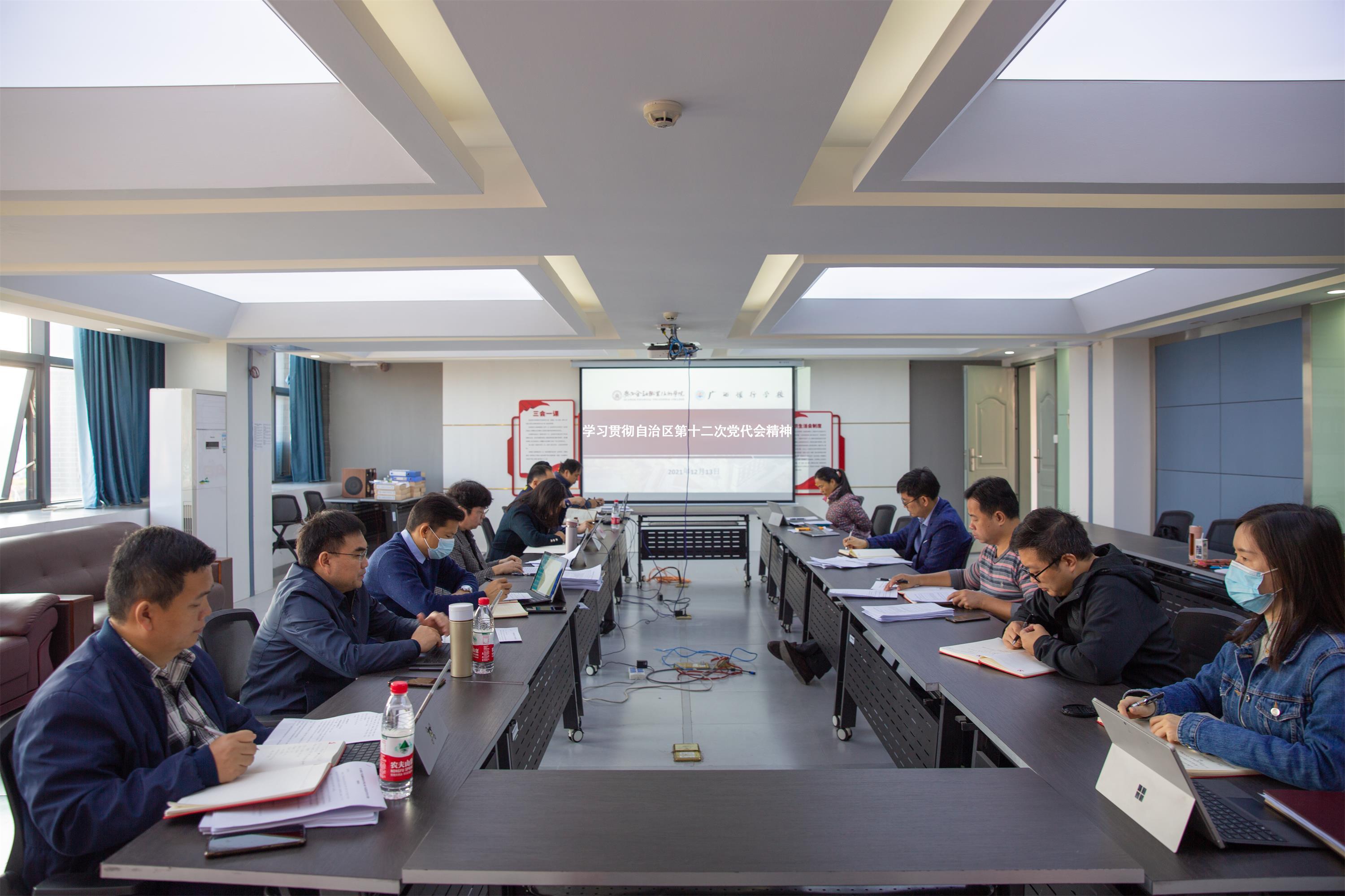 会议要求,要把学习贯彻自治区第十二次党代会精神与学习贯彻党的十九届六中全会精神紧密结合起来,与深入贯彻落实习近平总书记视察广西“4·27”重要讲话精神和对广西工作的系列重要指示要求、李克强总理视察广西的指示要求紧密结合起来,与深入开展党史学习教育紧密结合起来,迅速在全校范围内掀起学习宣传贯彻热潮,切实把思想和行动统一到大会作出的各项决策部署上来,以更加奋发有为的精神状态,时不我待的紧迫感做好“十四五”开局之年各项工作,团结带领广大师生争先创优、担当实干,确保各项工作落细落实落到位,为谱写新时代广西发展新篇章贡献金院的智慧和力量!