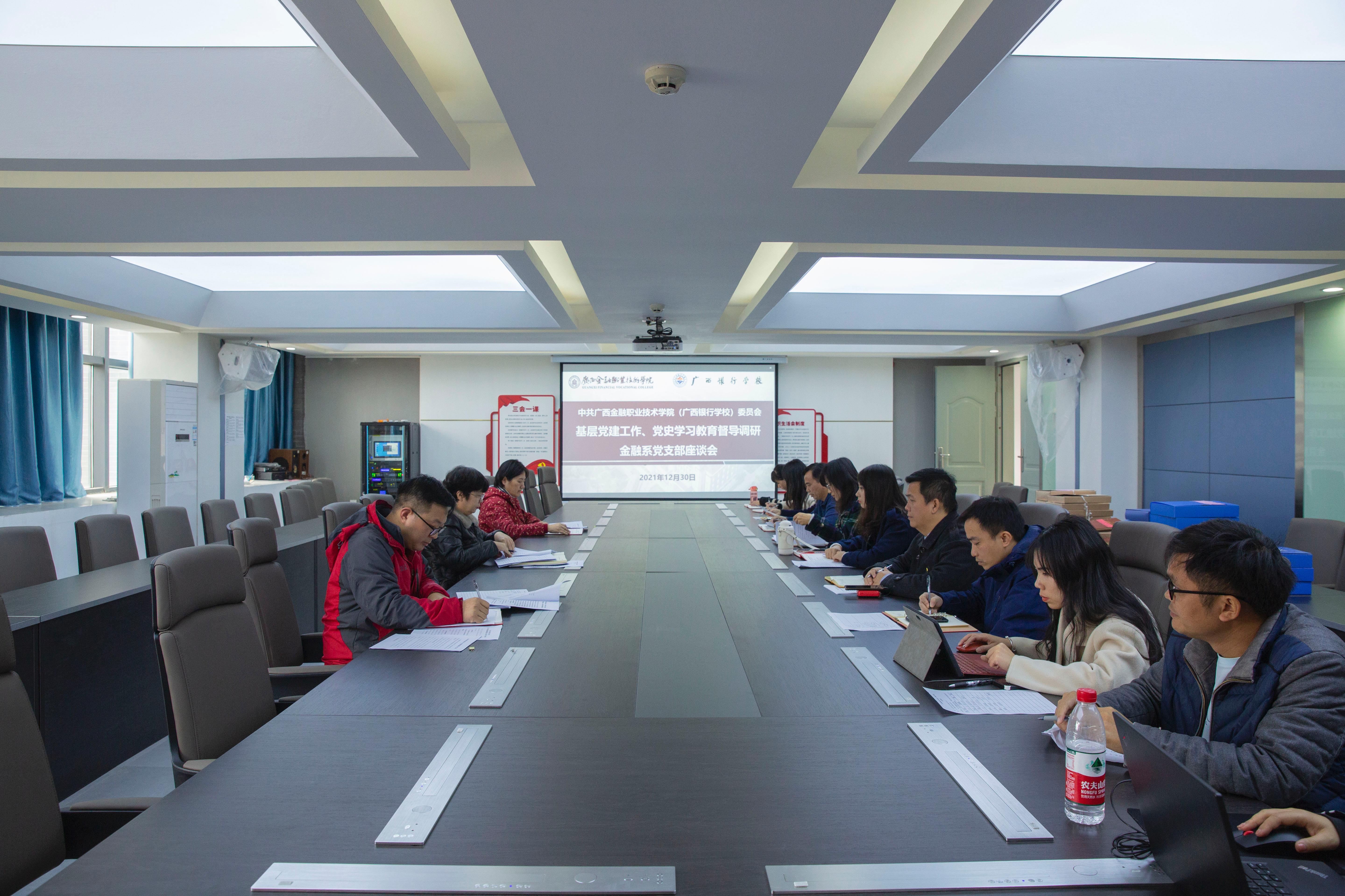 为进一步夯实基层党建工作基础,深化党史学习教育,2021年12月30日下午,学校基层党建和党史学习教育第一督导调研组深入直属第三党支部、金融系党支部、会计系党支部、投资与保险系党支部就基层党建工作、党史学习教育开展督导调研。第一督导调研组由党委书记沈立君,党委委员、党委宣传部副部长、党政办公室主任韩蓓丽、组织人事处组织统战科科长龙腾涵组成。督导调研组通过召开座谈会听取汇报、并现场查阅了资料台账和有关记录。