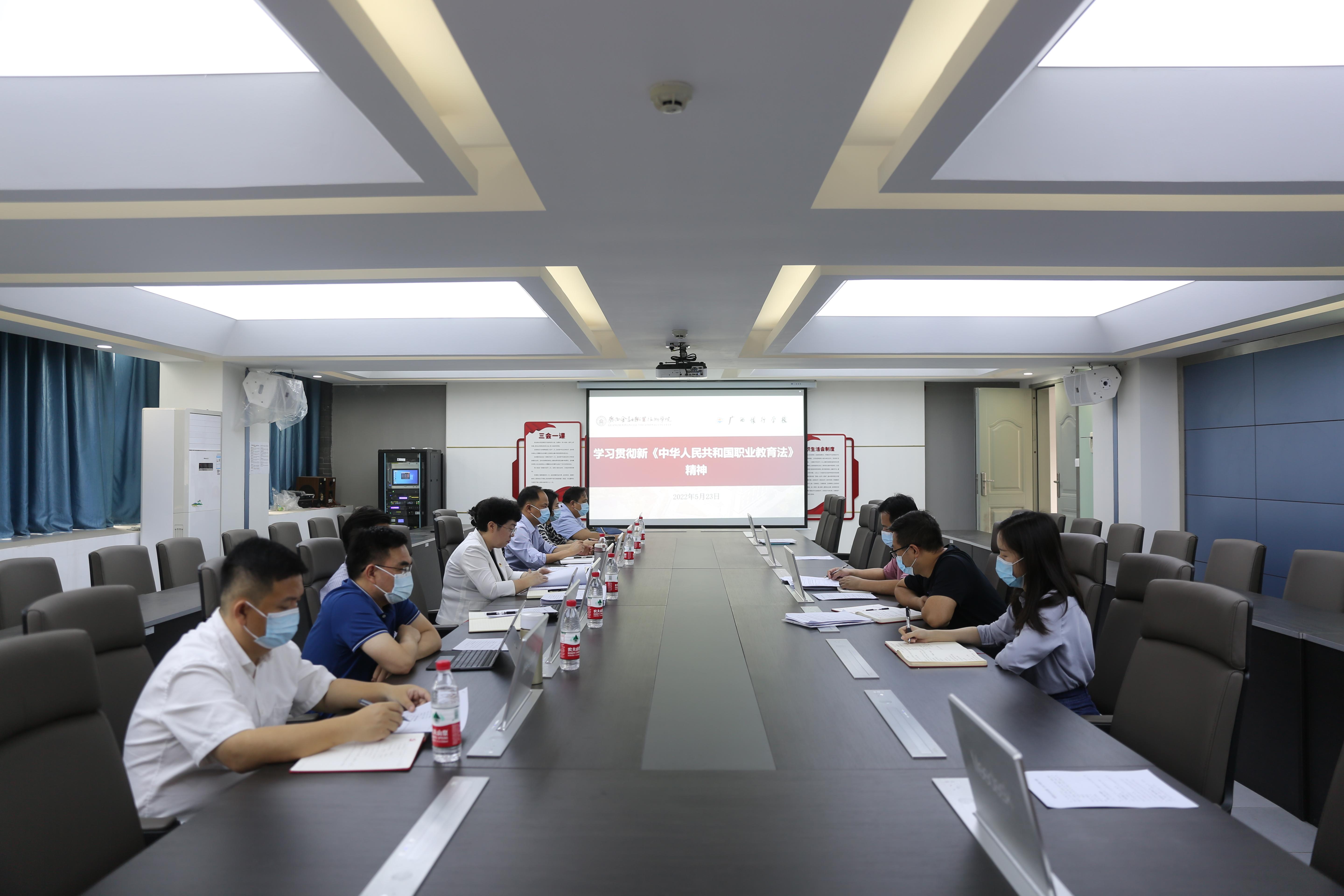 会议要求,各单位要通过多种形式深入学习,学法悟法,明确修订意义,提高运用 法治思维和法治方式推动教育改革发展。一是提高政治站位抓落实;二是增强学习自觉抓落实;三是加强党的建设抓落实;四是紧跟社会形势抓落实;五是结合学校实际抓落实。要将《职业教育法》与推动金院高质量发展相结合,深入推进产教融合、校企合作,坚持工学结合、知行合一;要将《职业教育法》与学校高质量发展相结合,与职教本科创建、深化“双高校”建设等重点任务相结合,推动学校发展再上新台阶,为建设好中国特色社会主义壮美广西、共圆复兴梦想作出金院贡献。