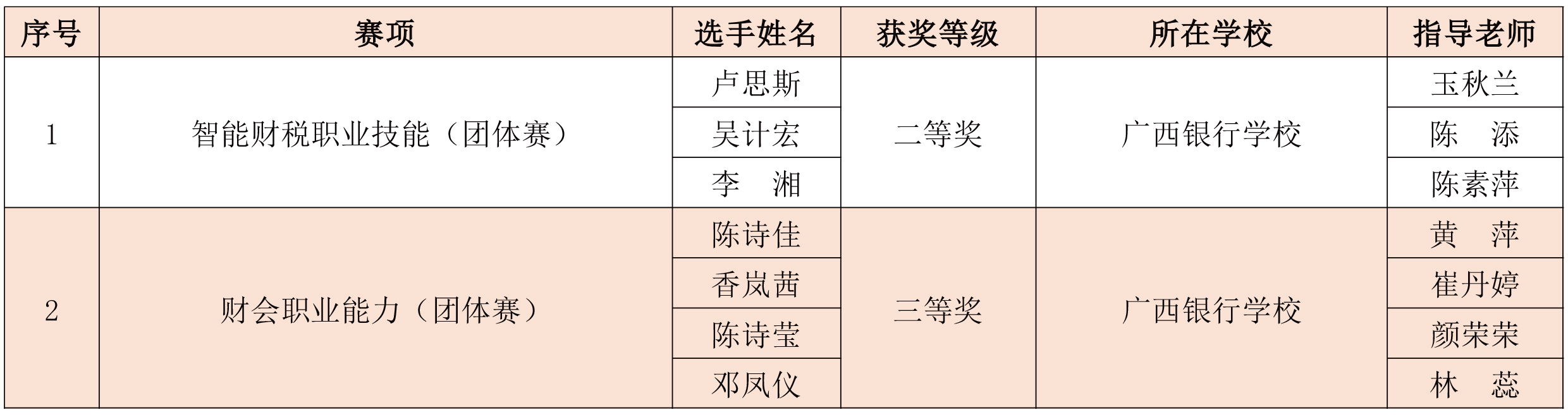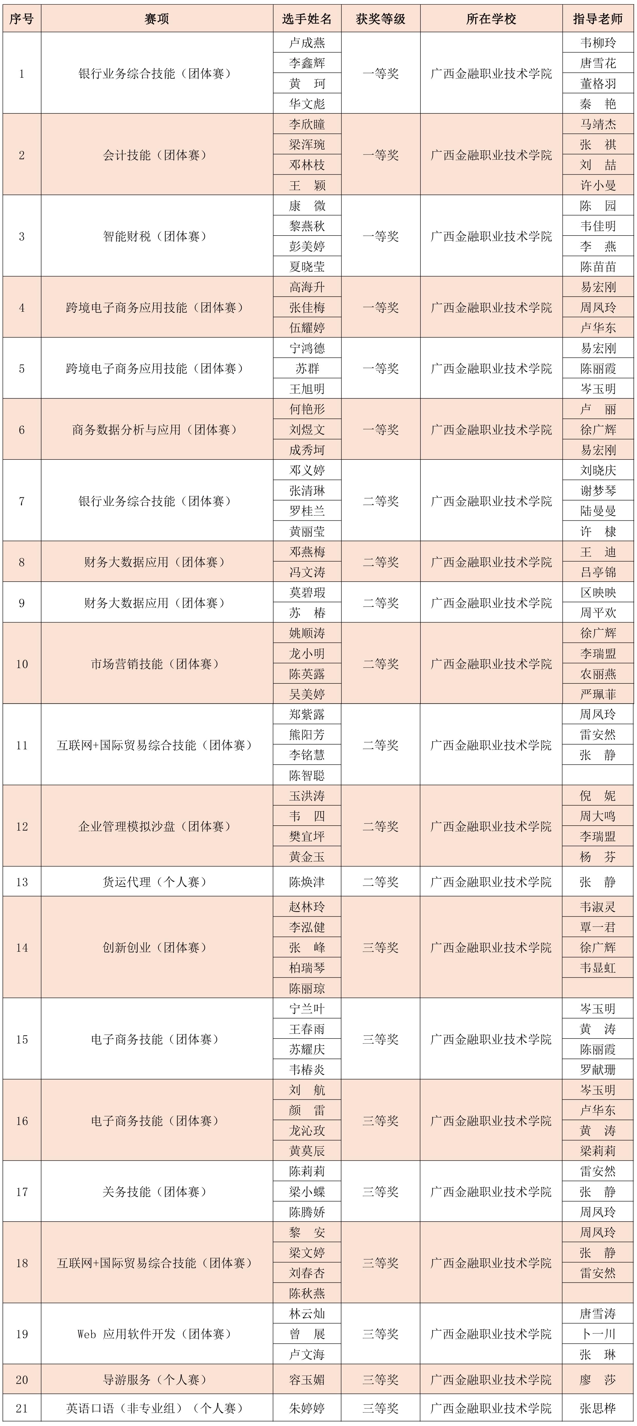 由自治区教育厅举办的2022年广西职业院校技能大赛于4月结束。5月10日,广西壮族自治区教育厅印发《自治区教育厅关于公布2022年广西职业院校技能大赛获奖名单的通知》(桂教职成〔2020〕20号)。伟德官网在高职组赛项中获得一等奖6项、二等奖7项、三等奖8项,在中职组赛项中获得二等奖1项、三等奖1项,其中,获得高职组银行业务综合技能(团体赛)一等奖,排名第1;高职组会计技能(团体赛)一等奖,排名第1。