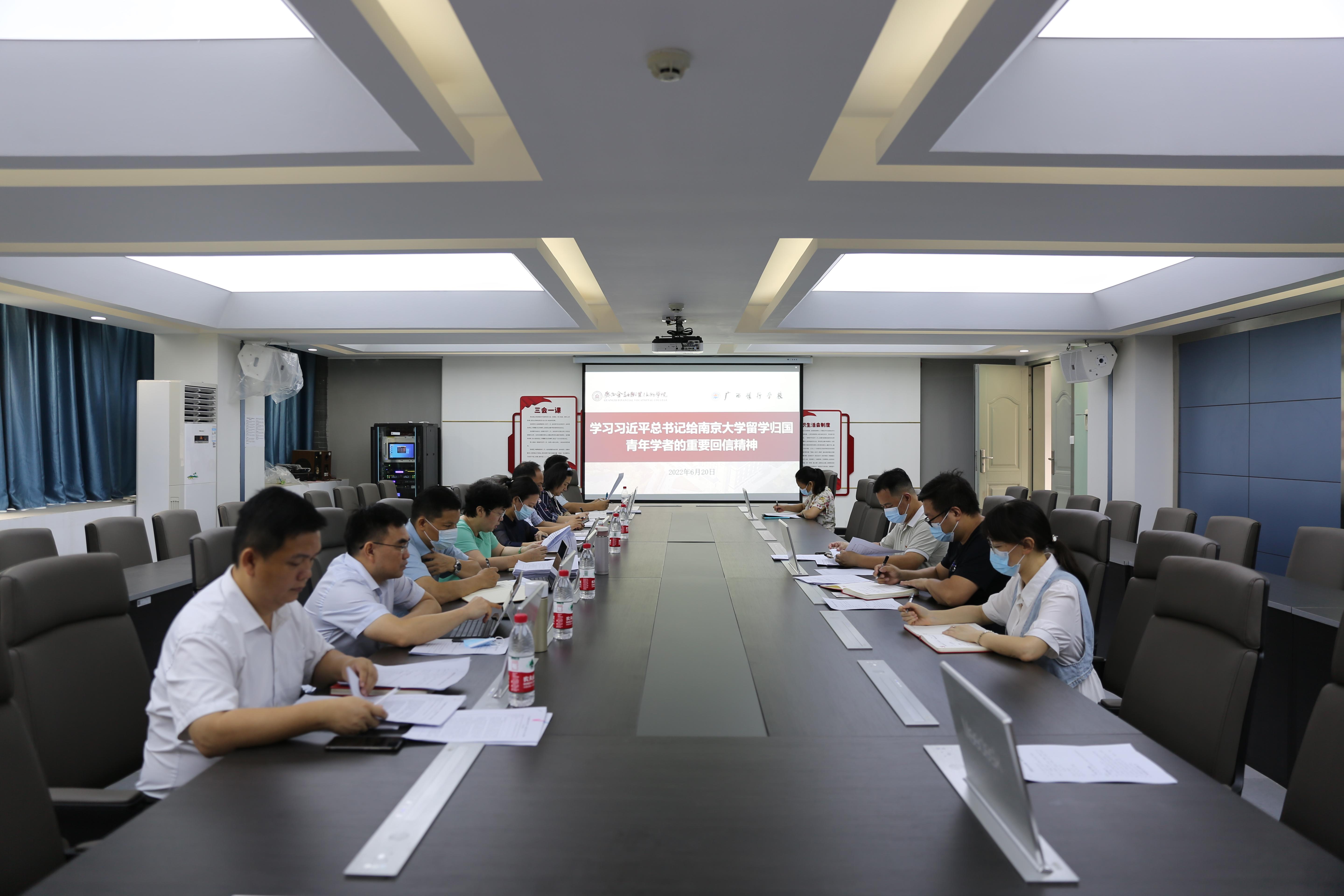 会议要求,习近平总书记给南京大学留学归国青年学者的重要回信充分体现了党中央对高等教育事业的高度重视和对高校青年教师的亲切关怀,我们要深刻领会把握,用心思考体悟,坚决贯彻落实。一是提高政治站位,认真学习贯彻,二要注重精神转化,推进落地见效,三要团结汇聚力量,共建幸福金院。我们要锚定党和国家中心任务、教育教学改革的热点问题、广大教师普遍关注的焦点问题,以建言献策现场座谈会、课题研究、调研活动等为载体,为学校发展建言献策,提高办学治校水平,大力弘扬伟大建党精神和报效祖国的爱国情怀,吸引更多高层次人才扎根金院(银校),共建幸福美好家园。