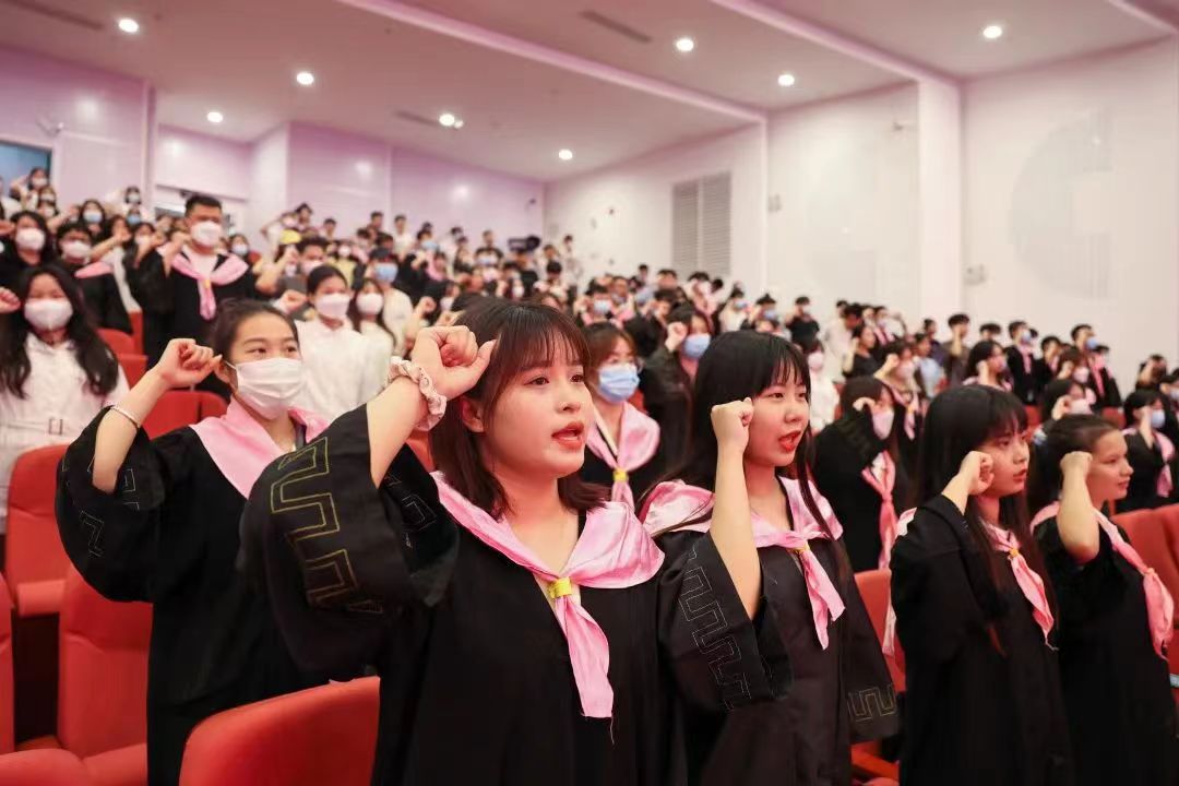 毕业生代表带领全体毕业生庄严宣誓,用掷地有声的誓言为2022届毕业生的大学生涯画上了圆满句号。并向全体老师鞠躬行谢礼,表达对老师的辛勤培育之情。
