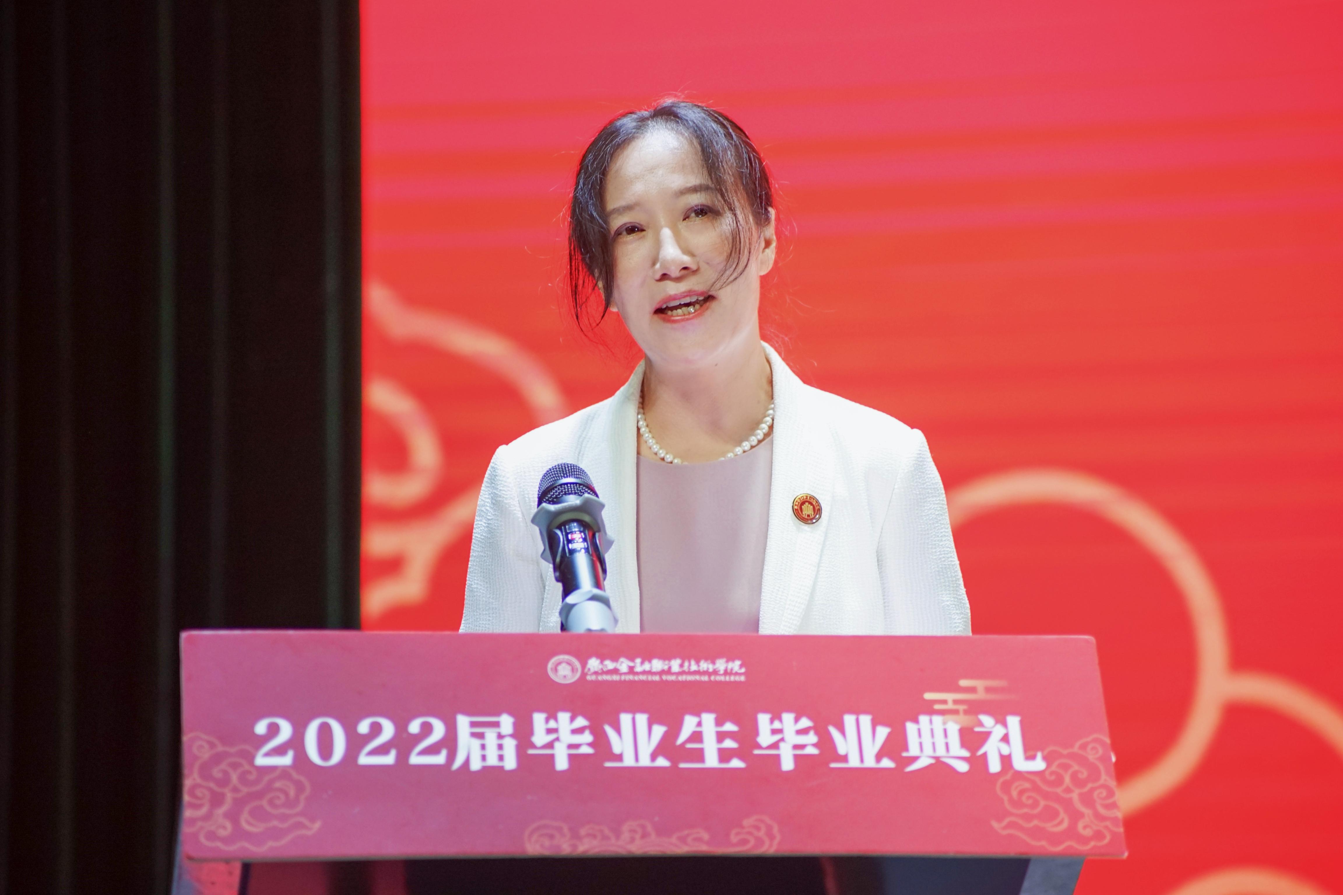 投资与保险系教师黎秋华副教授代表全体教师上台寄语。她回顾了三年师生的点点滴滴,并希望同学们树立终身学习理念,学会学习本身;会做事,会做人,有担当;提高自己的心理素质,要有坚韧不拔的抗挫折能力。