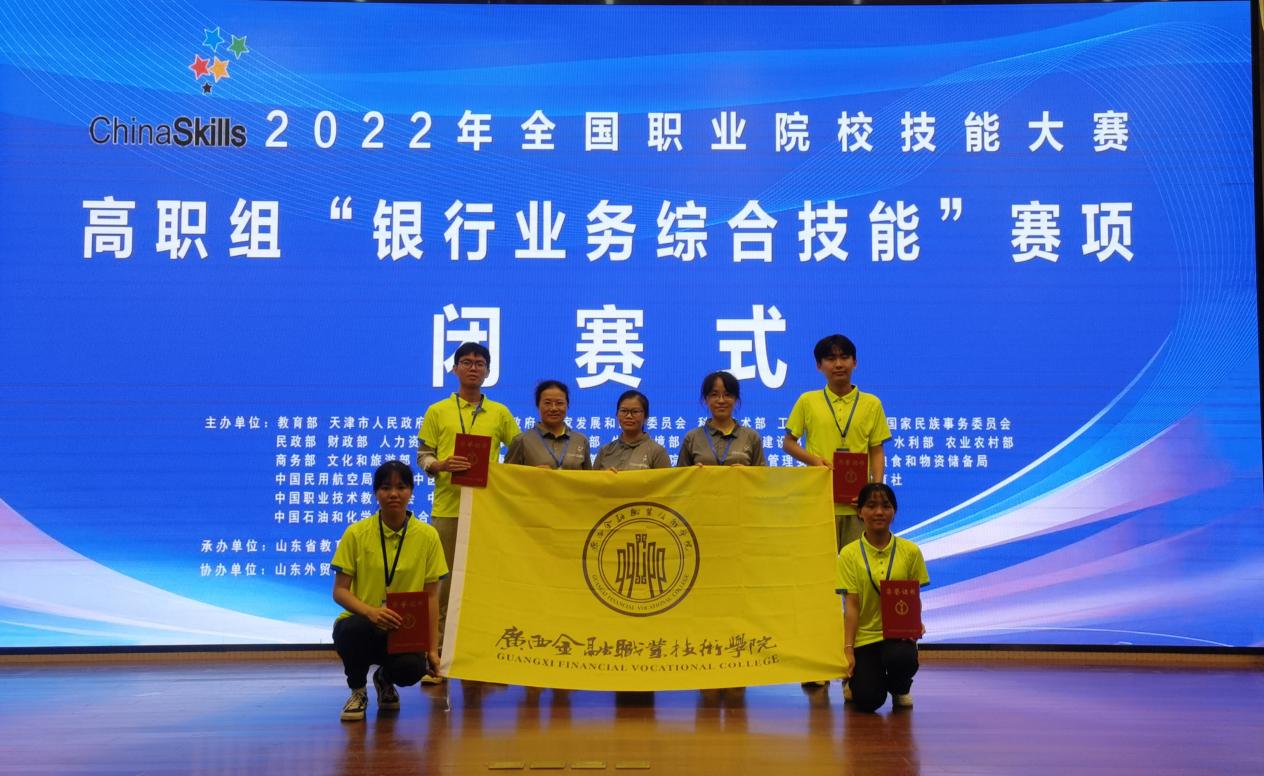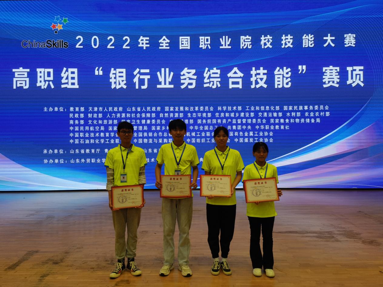 2022年全国职业院校技能大赛高职组“银行业务综合技能”赛项于8月14日—15日在山东省青岛市山东外贸职业学院举行。伟德官网金融系韦柳玲、唐雪花两位老师指导的4名参赛选手华文彪、李鑫辉、黄珂、卢成燕经过两天的激烈角逐,最终荣获全国团体三等奖。