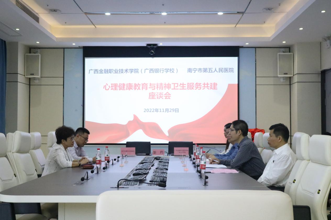 南宁市第五人民医院党委书记张玲介绍了南宁市第五人民医院的专业优势,希望通过本次医校合作项目,开展探索学生心理危机预防与干预、专兼职心理咨询教师能力提升等为主要内容的医校合作模式,促进学生的健康成长,实现互利共赢。