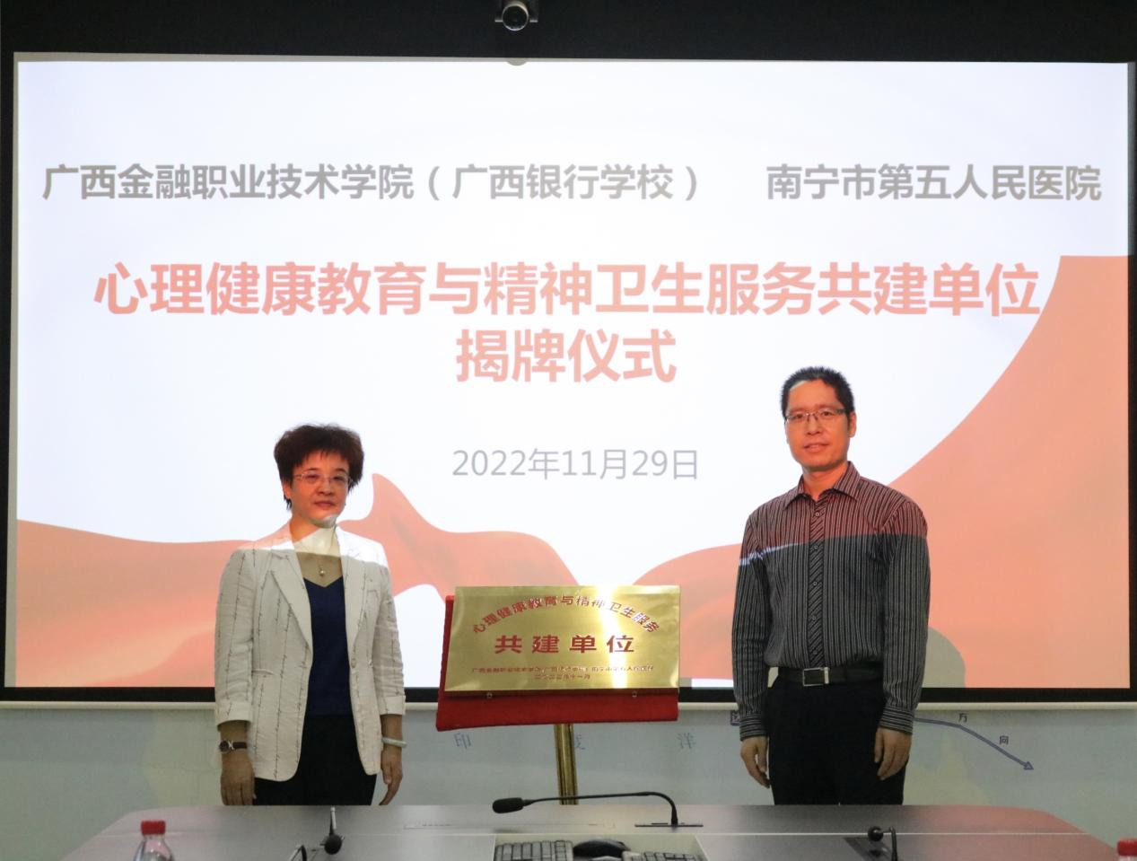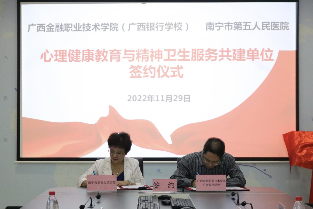 2022年11月29日,伟德官网与南宁市第五人民医院的心理健康教育与精神卫生服务合作共建单位签约揭牌仪式在西校区行政楼103会议室顺利举行。南宁市第五人民医院党委书记张玲、心理健康科科主任蒋春雷参加签约揭牌仪式,伟德官网党委书记李高岩、党委副书记、纪委书记刘华政,学生工作与招生就业处处长校周海峰,与心理健康教育专职教师代表、各系教师代表共同出席。