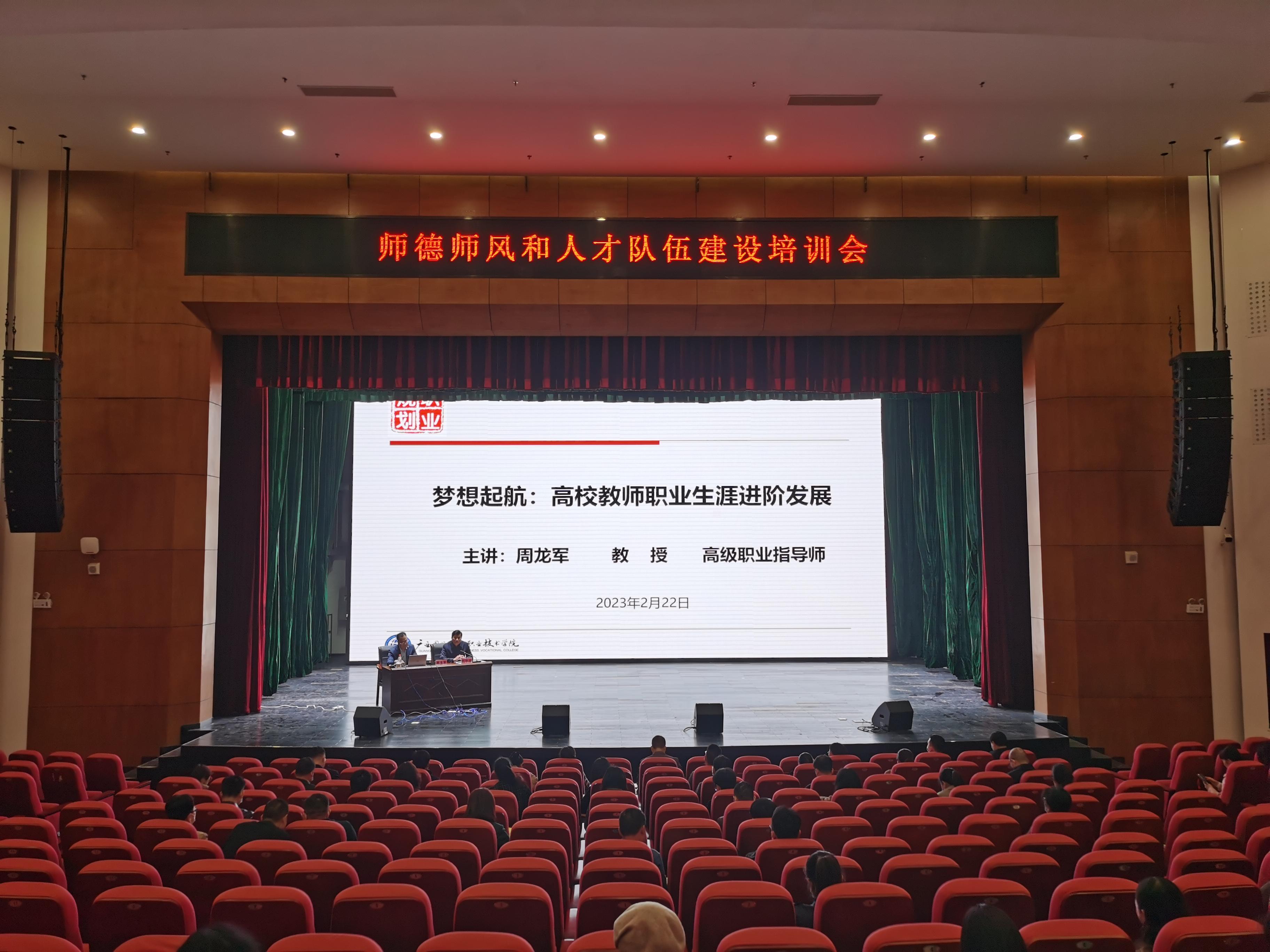 为加强学校师德师风建设、提高人才队伍建设水平,帮助广大教职员工增强职业规划意识。2月22日下午,学校特邀请广西国际商务职业技术学院教授、国家高级职业指导师周龙军教授为全校教职工开展师德师风和人才队伍建设培训。培训由学校党委副书记、纪委书记刘华政主持。