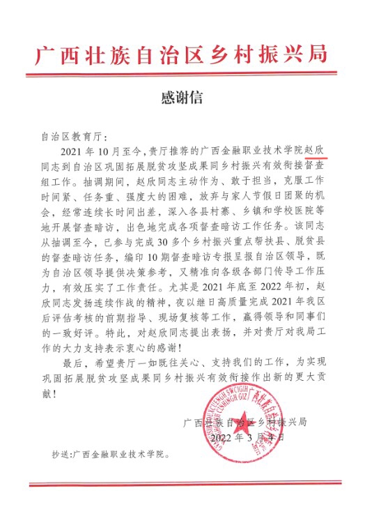 2021年10月至今,伟德官网赵欣同志受推荐到自治区巩固拓展脱贫攻坚成果同乡村振兴有效衔接督察组工作。赵欣同志在抽调期间,克服工作时间紧、任务重、强度大的困难,放弃与家人节假日团聚的机会,经常连续长时间出差,带队深入各县村寨、乡镇和学校医院等地开展督查暗访,完成106个有巩固脱贫成果任务的县(市、区)平均2次以上暗访任务。期间共编印督查暗访专报43期,红黑榜通报4期,先后获得自治区党委主要领导批示15次,自治区党委、政府分管领导批示30多次,为自治区领导决策提供了科学参考,有力推动了问题的整改落实,展现出良好的政治素质和较强的工作能力。特别在配合完成2022年国家巩固脱贫成果后评估工作期间,赵欣同志发扬连续作战的精神,认真负责,克服困难,敢于担当,高质量完成前期指导、现场复核、问题梳理和汇总等工作,赢得领导和同事的好评和认可。