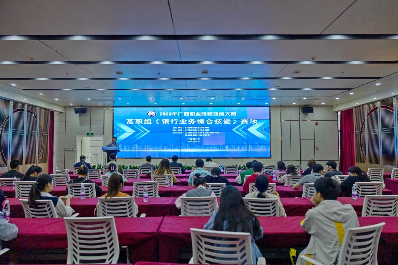 3月18日,2023年广西职业院校技能大赛高职组《银行业务综合技能》赛项在伟德国际victor1946顺利开赛。全区共有16所高职院校31支才赛队伍124名参赛选手参与角逐。大赛由广西教育厅主办,深圳智盛信息技术股份有限公司及深圳典阅科技有限公司提供技术支持。
