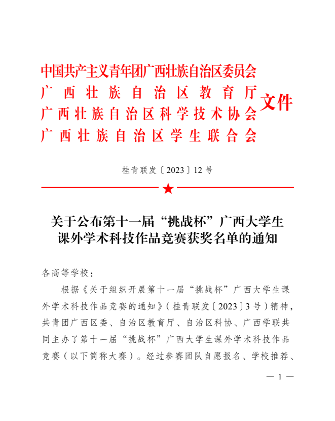近日,共青团广西区委公布了第十一届“挑战杯”广西大学生课外学术科技作品竞赛获奖名单。伟德官网推报参赛的作品在全区1473件参赛作品中脱颖而出,其中特等奖2项、一等奖2项、二等奖10项、三等奖9项,学校获奖数量及获奖等级均创历史最佳“战”绩!
